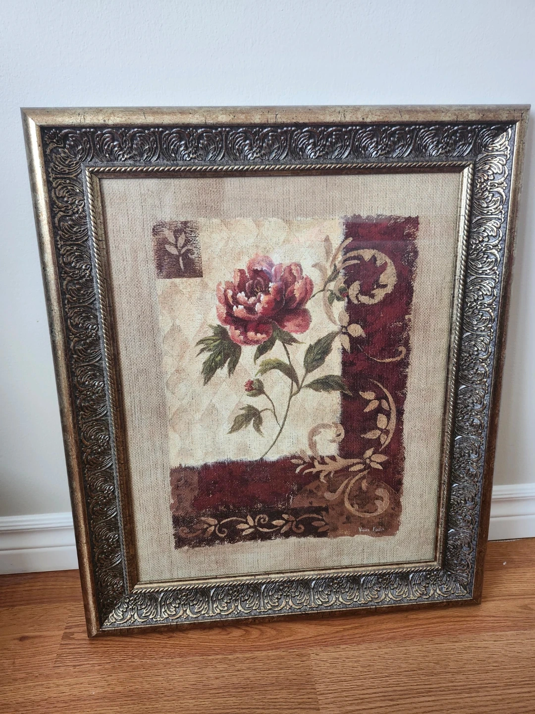 A lovely framed piece of wall art featuring a floral design. The frame has an intricate, decorative pattern and the artwork itself has a warm, inviting palette. It's in great condition and ready to brighten up any room