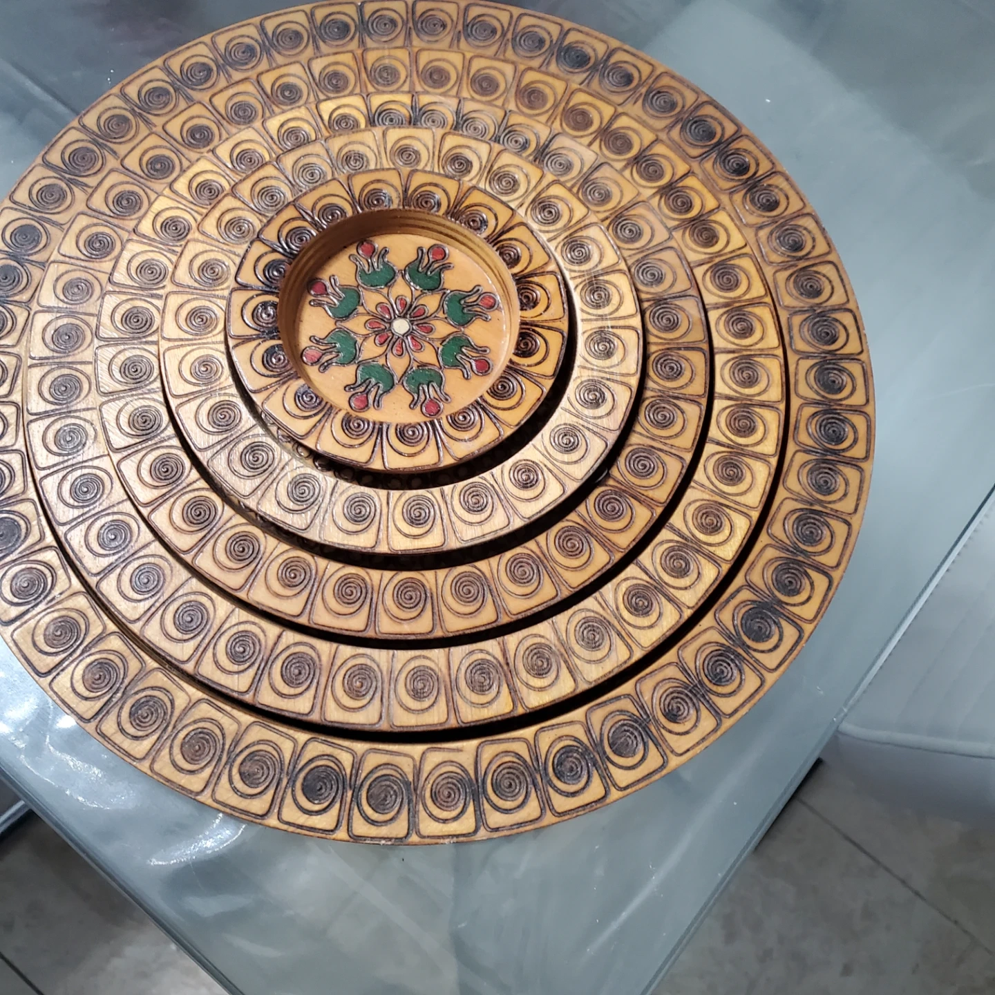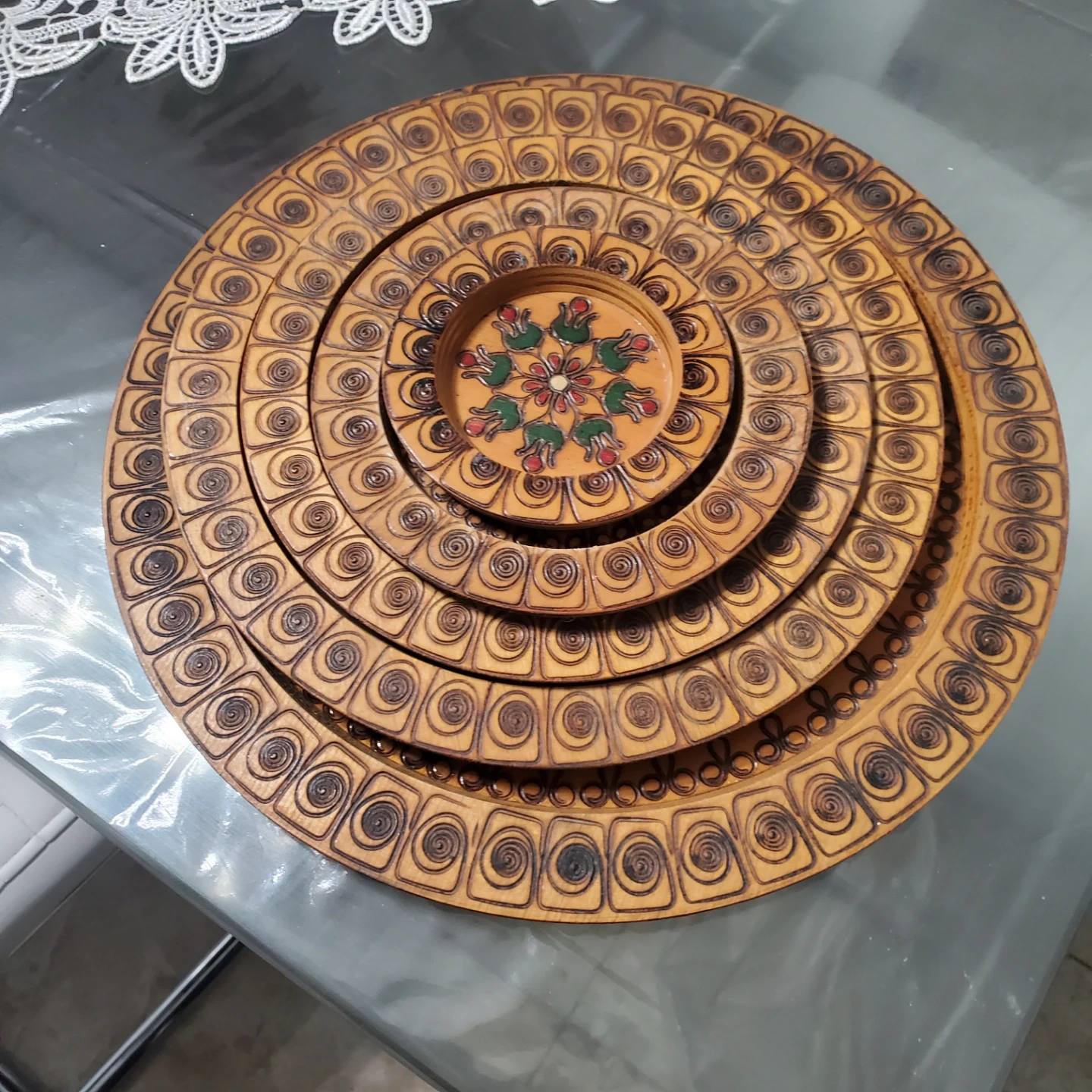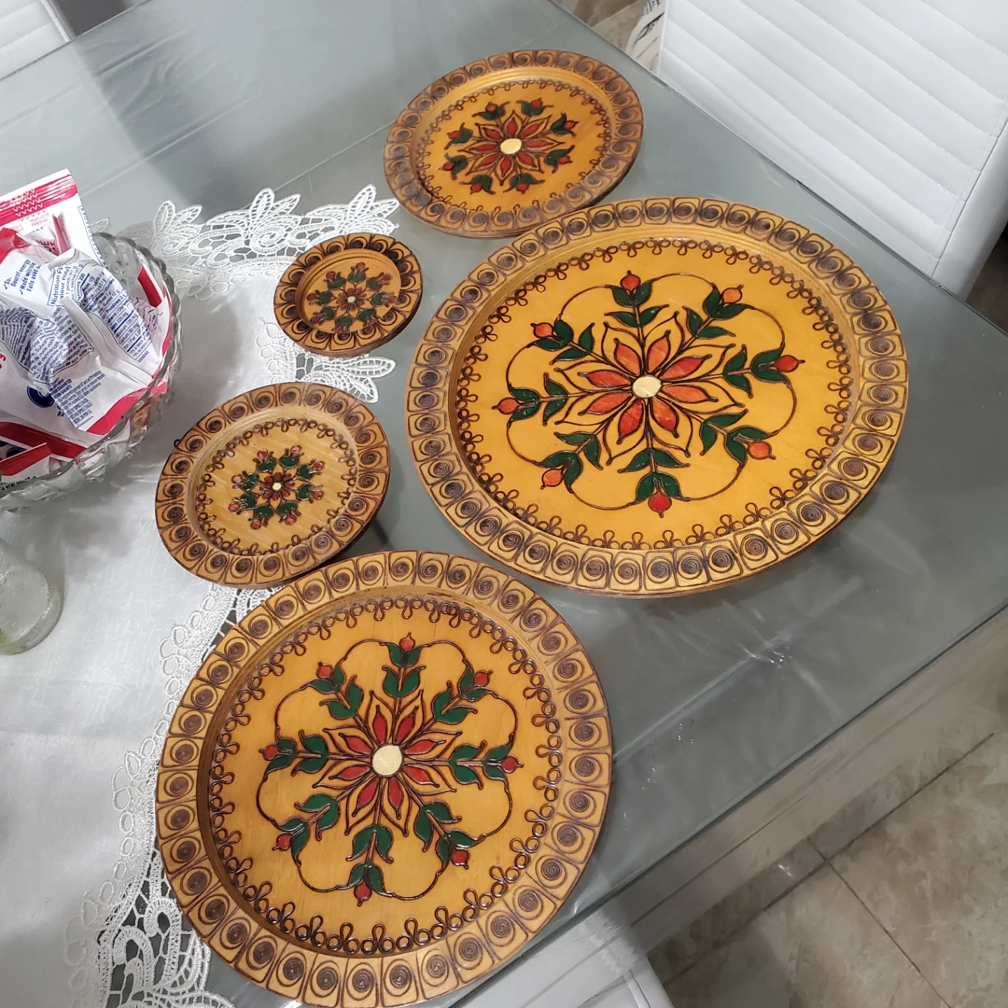 This set includes several decorative wooden plates with a unique carved design and hand-painted floral accents. Made of wood. Great for wall decor!