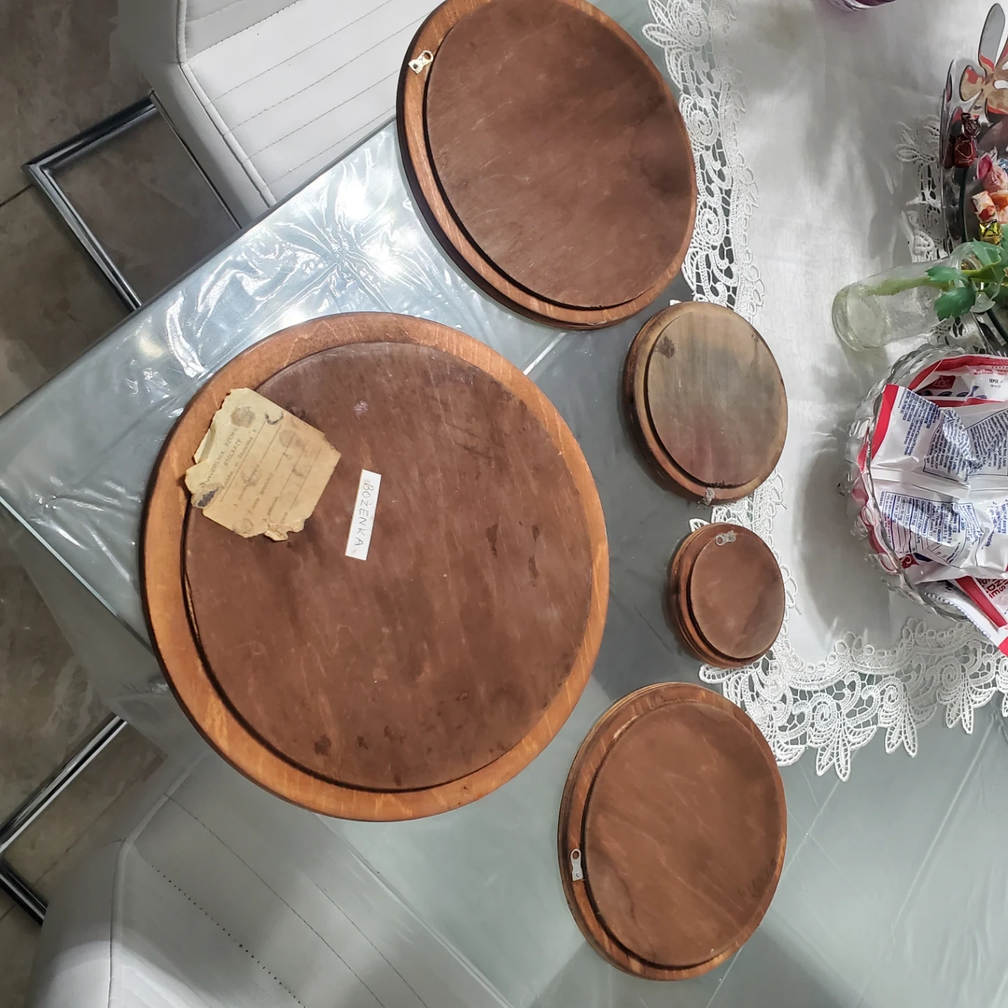 This set includes several decorative wooden plates with a unique carved design and hand-painted floral accents. Made of wood. Great for wall decor!