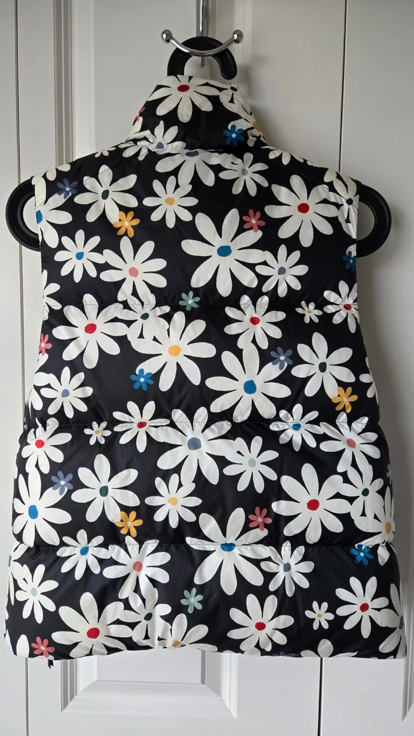 This reversible vest features a black puffer exterior and a vibrant floral print on the interior lining and collar. It's designed for warmth and style.