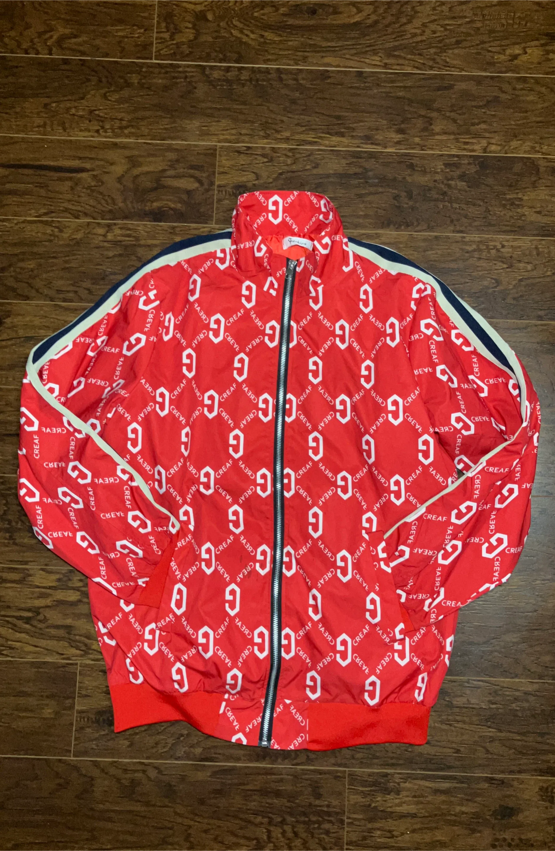This is a red track jacket with an all-over print of the letters 'CREAF' and 'G' symbols. It features a full-zip front and striped accents on the sleeves. A label inside indicates 'Fashion'.