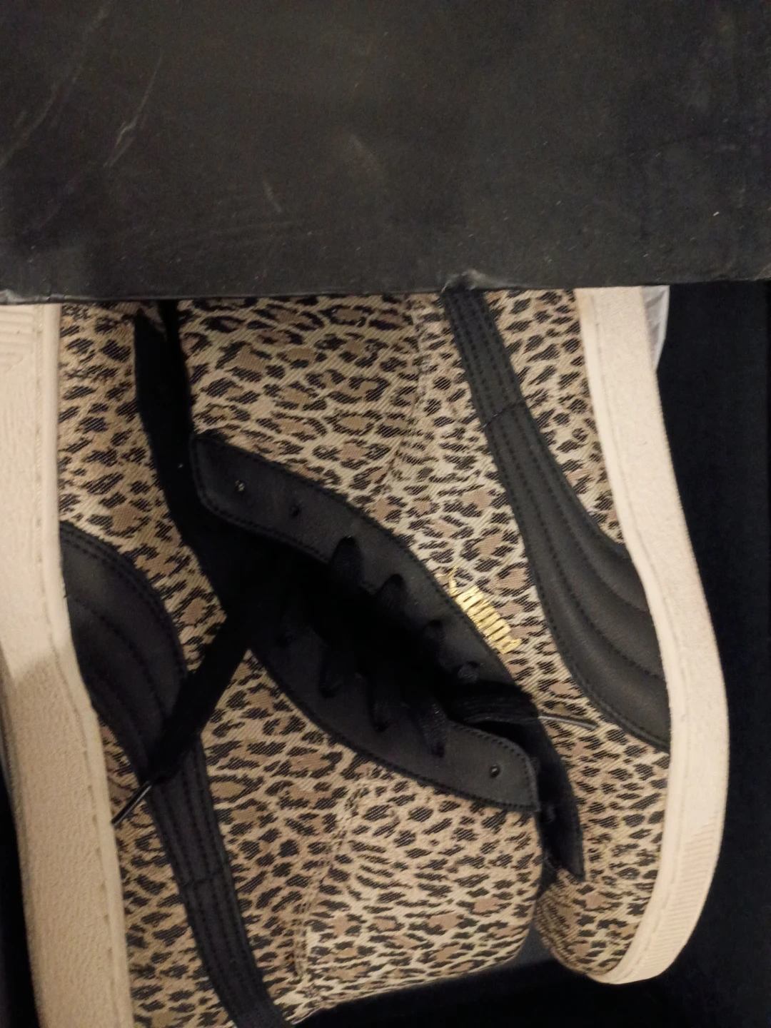 Puma Suede Mid Classic high top sneakers in a leopard print design. Features a black Formstrip and black laces. Size US 14. Includes original box.