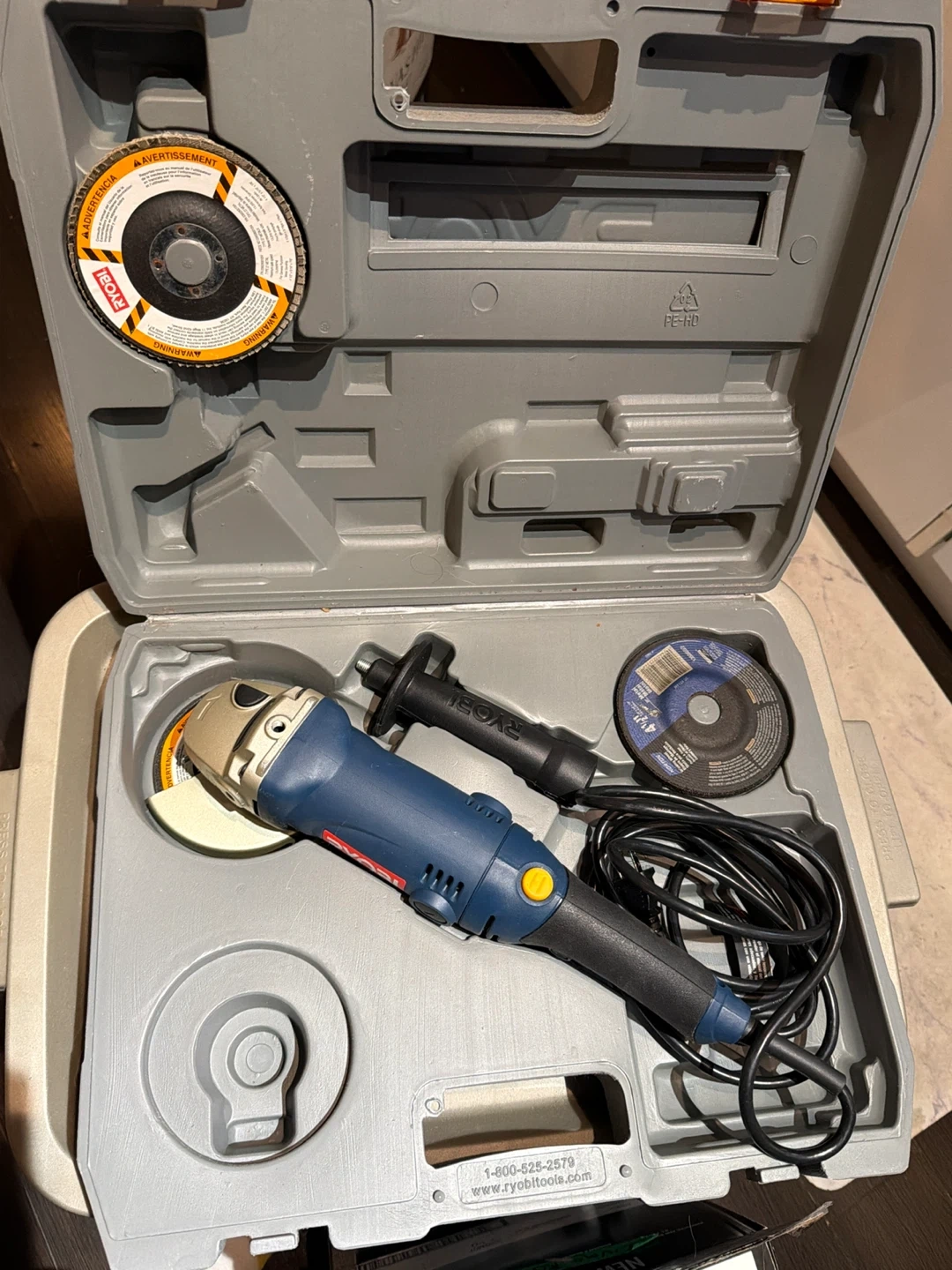 Never used, practically vintage but brand new Ryobi angle grinder kit. Kept inside in a closet, no damage. It comes with the grinder, handle, and two cutting discs. All components fit neatly into the included carrying case.