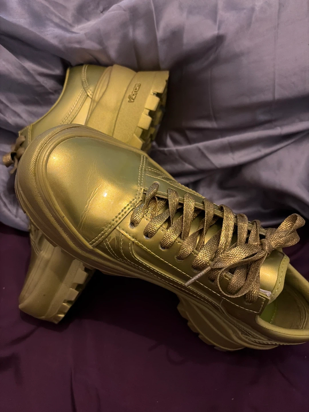 These Vans sneakers are a shiny gold greenish metallic colour. They feature Vans Ultracush insoles for comfort. US Men's size 9, which is a US Women's 10.5.