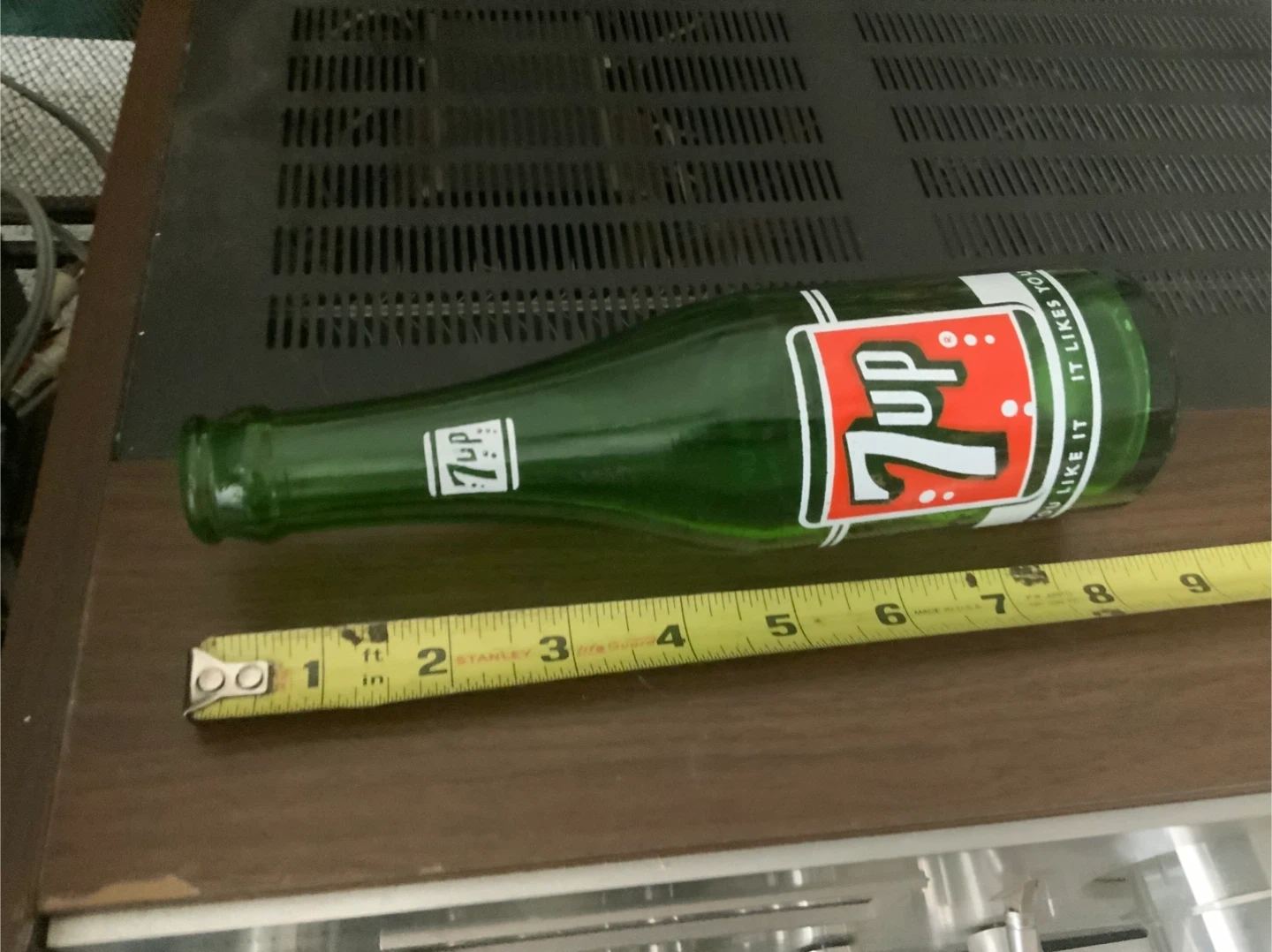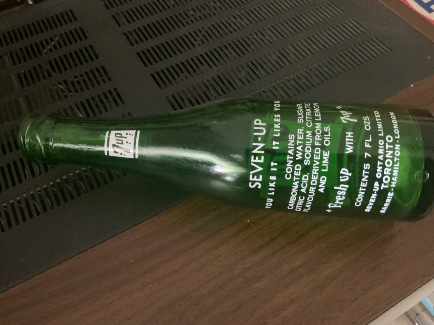 This is a classic green glass bottle of 7UP. It's a 7 fluid ounce size and was bottled by Seven-Up Ontario Limited in Toronto, Barrie, and Hamilton, London. The ingredients listed are carbonated water, sugar, citric acid, sodium citrate, flavour derived from lemon and lime oils. A neat collectible for any 7UP fan!