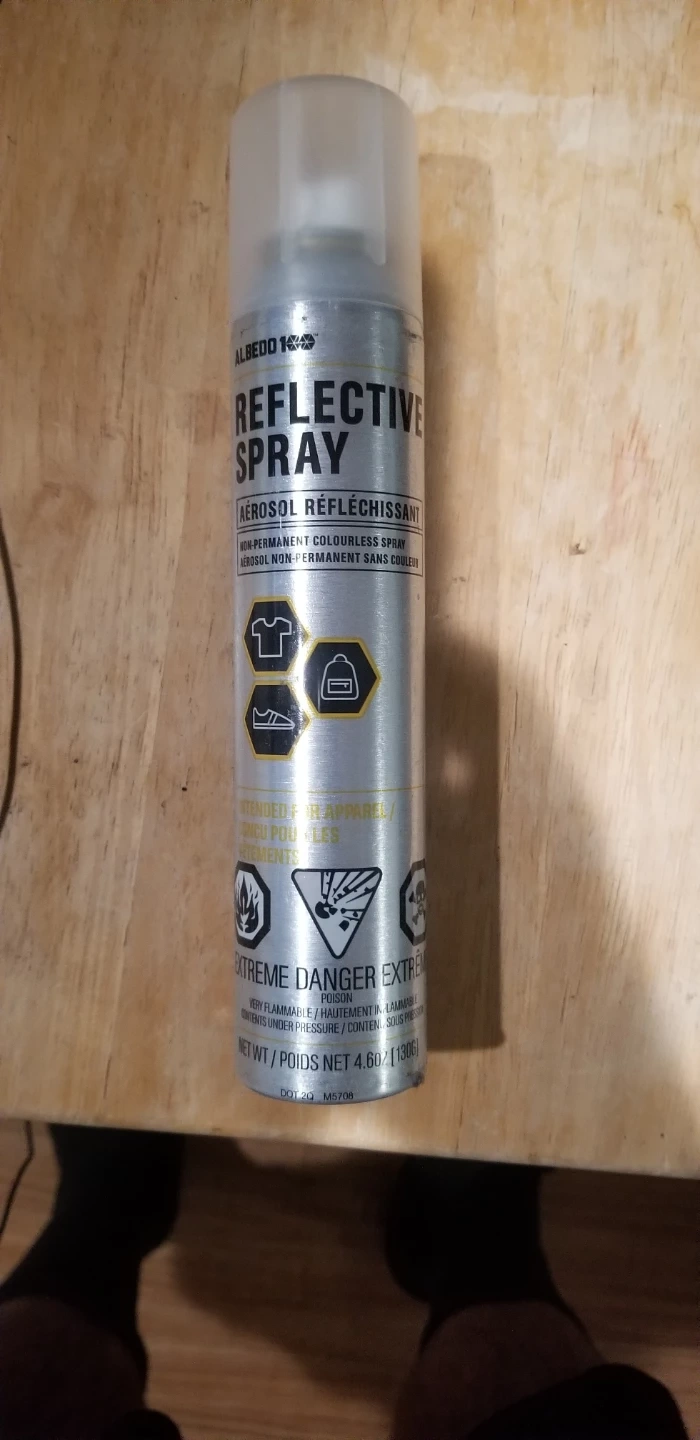 Selling a can of Albedo 100 Reflective Spray. It's an aerosol non-permanent colorless spray. Can be used on apparel and other items to add reflectivity.