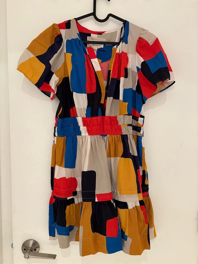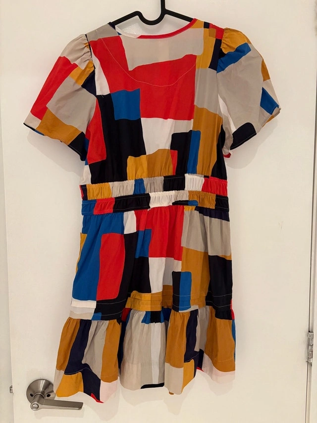 Chic dress with a striking geometric pattern. Features bold red, blue, yellow, and black hues. Has pockets! Petite/short sizing. Pickup at King and Portland. Cash only.