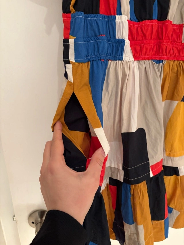 Chic dress with a striking geometric pattern. Features bold red, blue, yellow, and black hues. Has pockets! Petite/short sizing. Pickup at King and Portland. Cash only.
