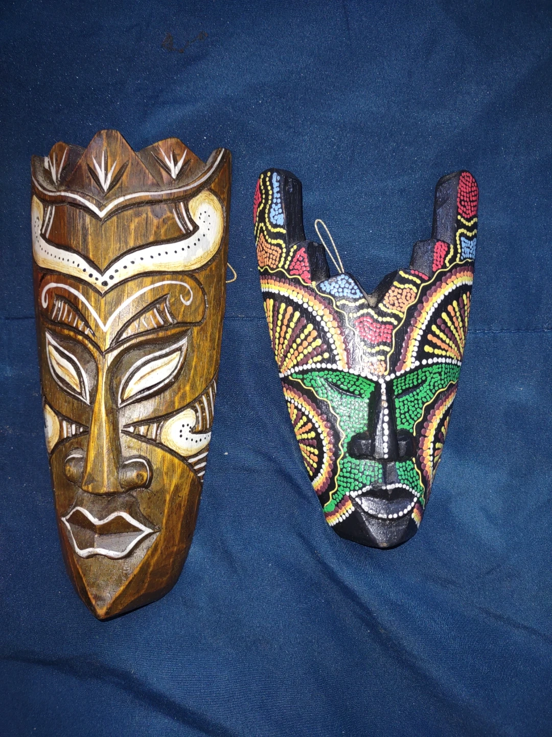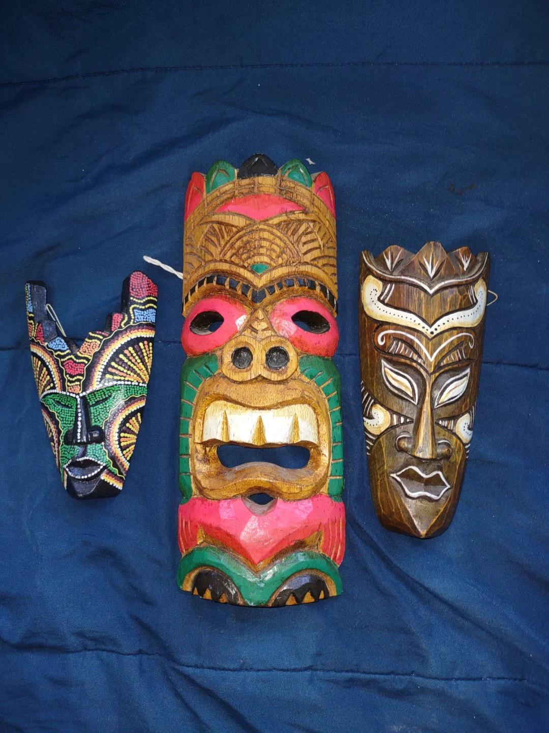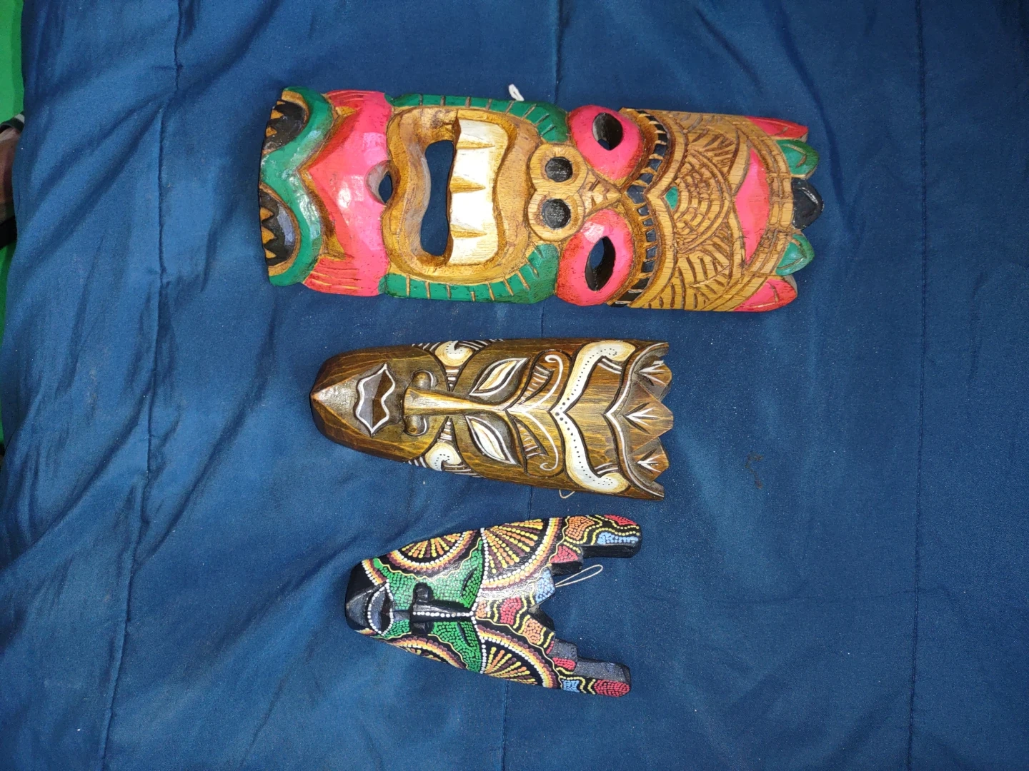 This set includes three carved wooden masks, each with a unique painted design. They're colourful and handcrafted, perfect for adding a touch of tropical flair to your home decor. These masks would make a neat statement piece on a wall.