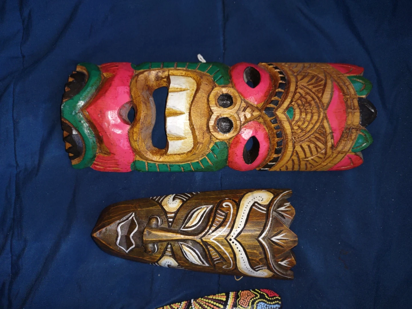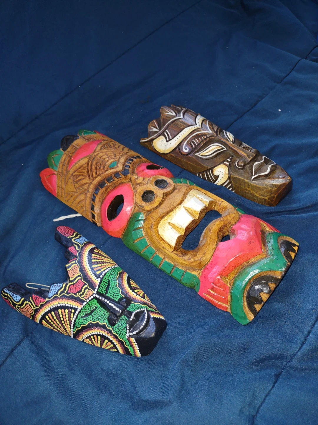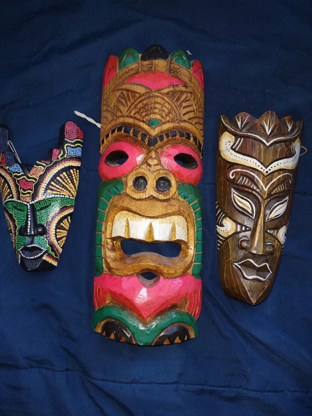 This set includes three carved wooden masks, each with a unique painted design. They're colourful and handcrafted, perfect for adding a touch of tropical flair to your home decor. These masks would make a neat statement piece on a wall.