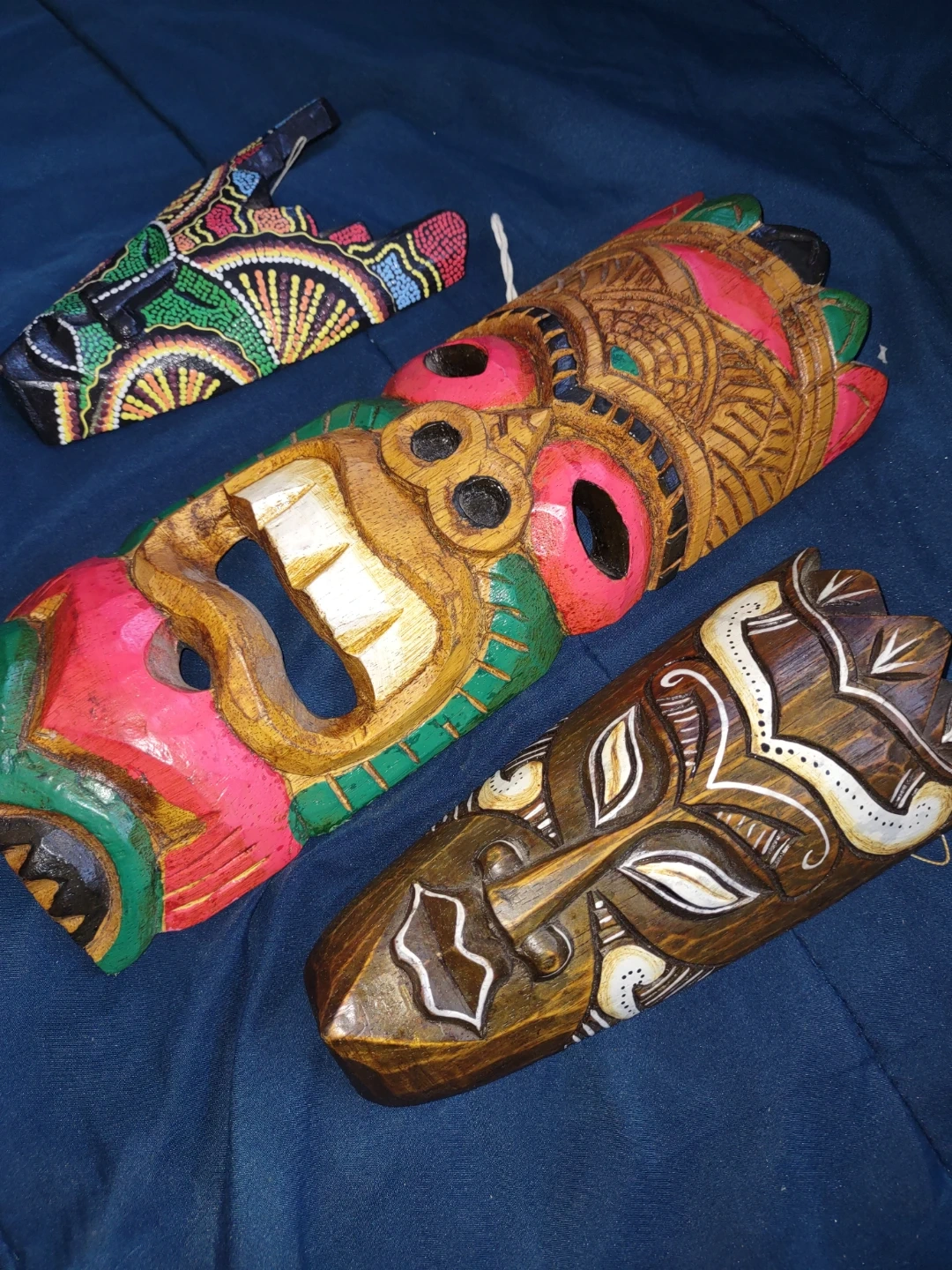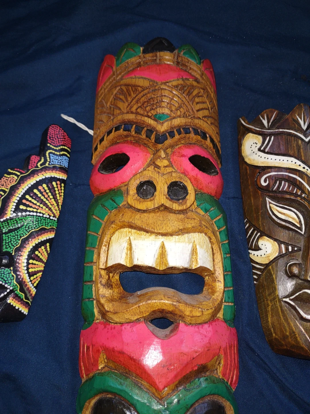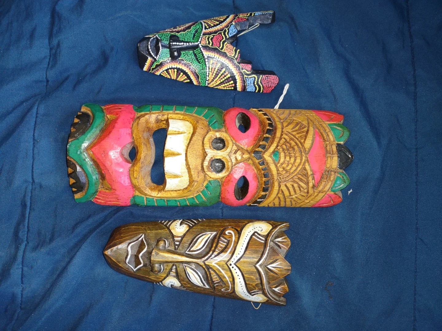 This set includes three carved wooden masks, each with a unique painted design. They're colourful and handcrafted, perfect for adding a touch of tropical flair to your home decor. These masks would make a neat statement piece on a wall.