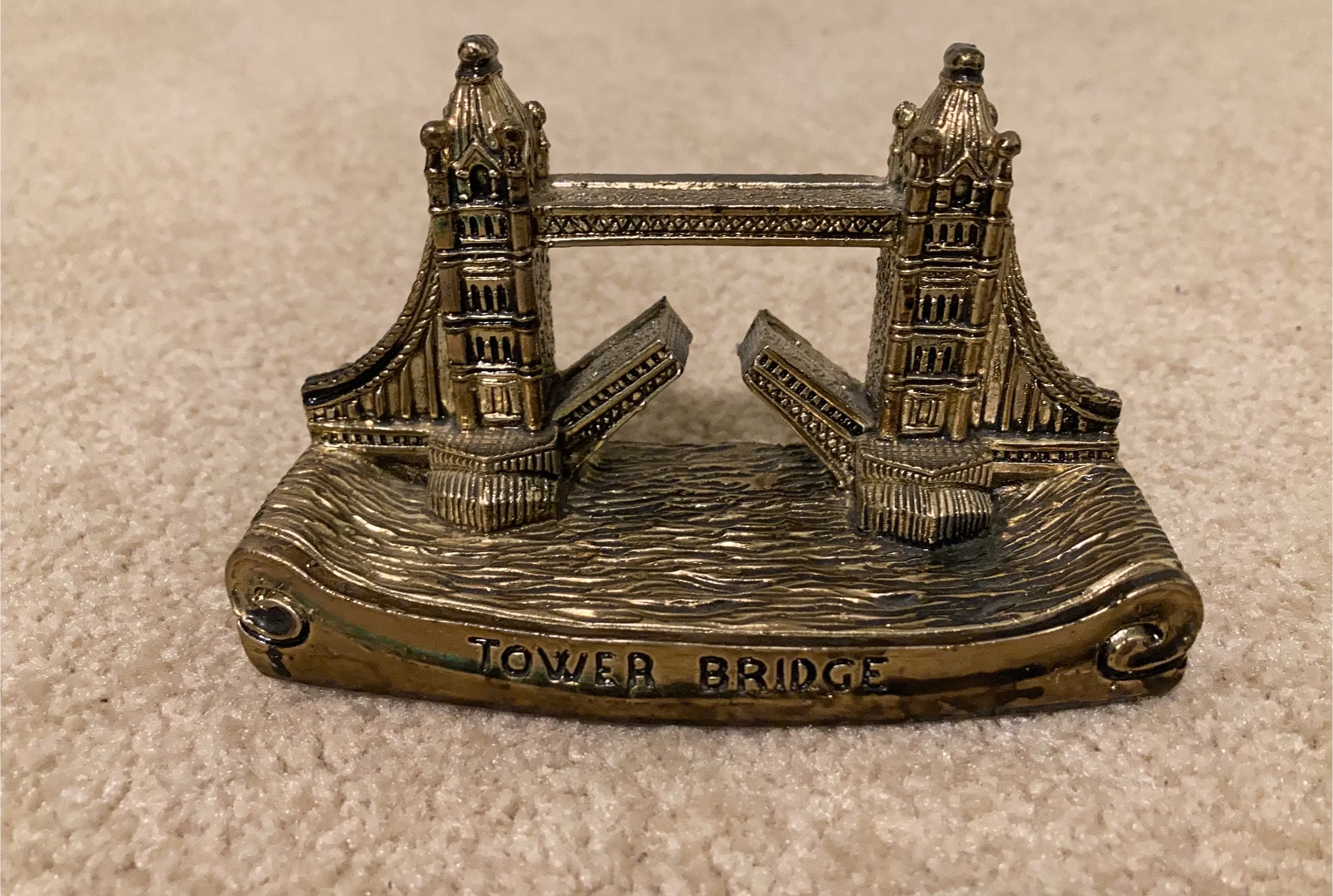A small, metallic replica of the Tower Bridge. It's detailed with the bascules raised. This collectible piece would make a nice addition to a display shelf.
