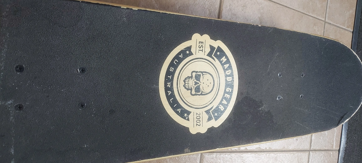 Selling a used Mad Gear skateboard and helmet. Good for beginners or anyone looking to get into skateboarding! The skateboard has a cool skull design, and the helmet is a basic black colour for safety.