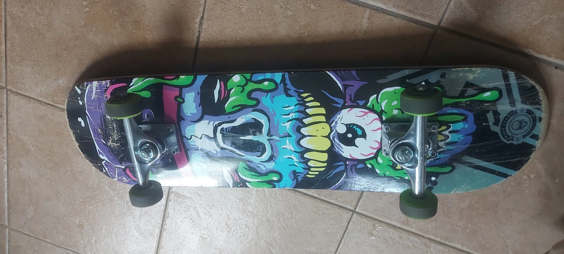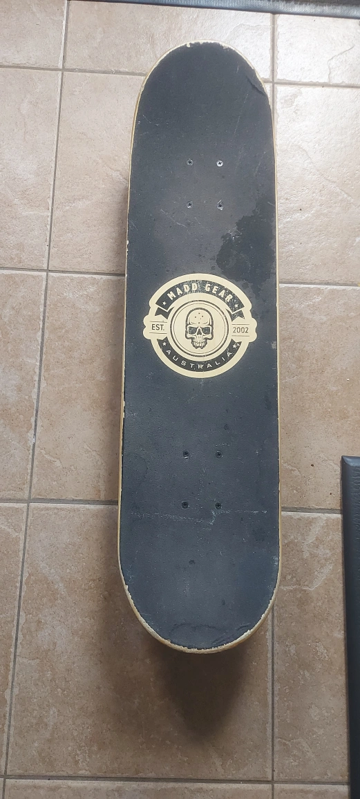 Selling a used Mad Gear skateboard and helmet. Good for beginners or anyone looking to get into skateboarding! The skateboard has a cool skull design, and the helmet is a basic black colour for safety.