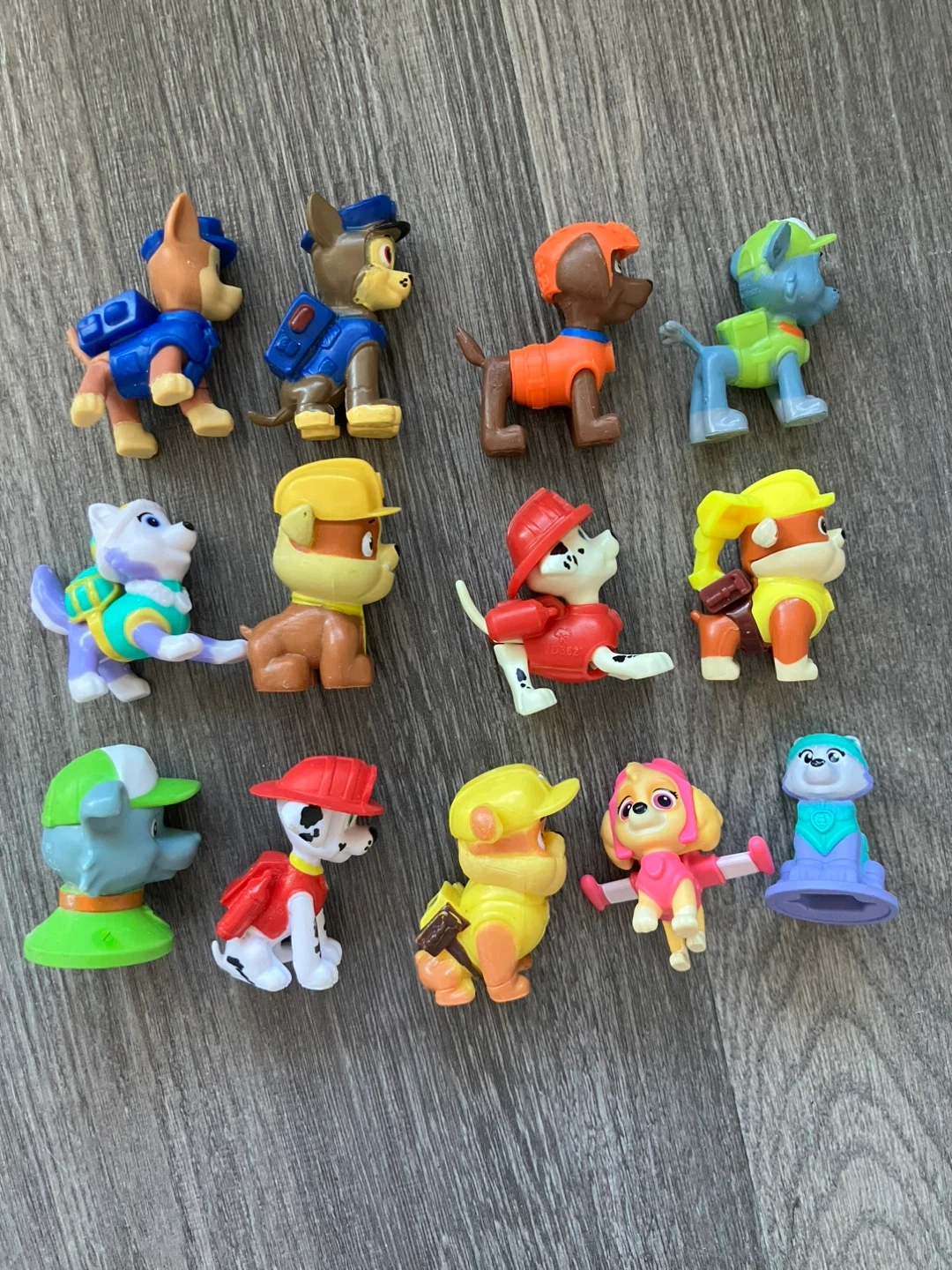 A collection of 11 Paw Patrol character figurines. These are colourful plastic toys. They're great for young fans of the show who enjoy imaginative play.