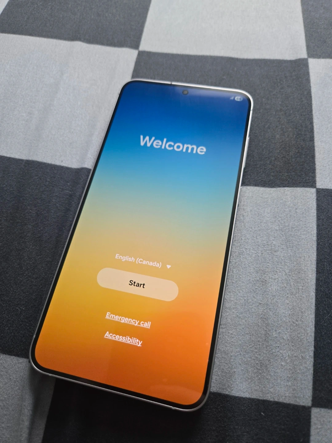 This is a Samsung Galaxy smartphone. It comes with a USB-C charging cable. The phone is ready for setup and includes English (Canada) as a language option. Brand new phone never been used.