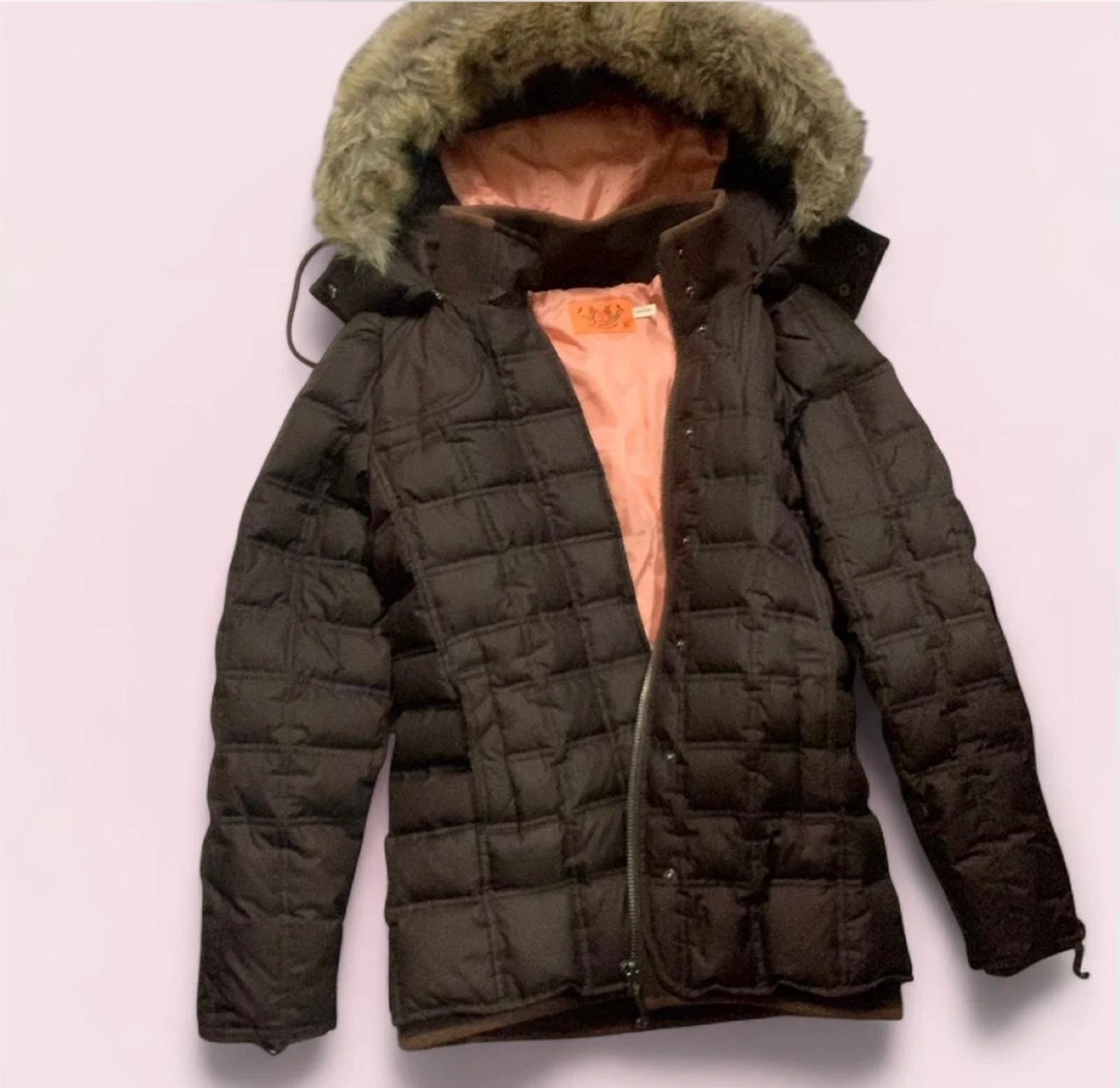 Juicy Couture puffer jacket in brown. It's a size small. The lining is a soft pink colour. It has a faux fur-lined hood.