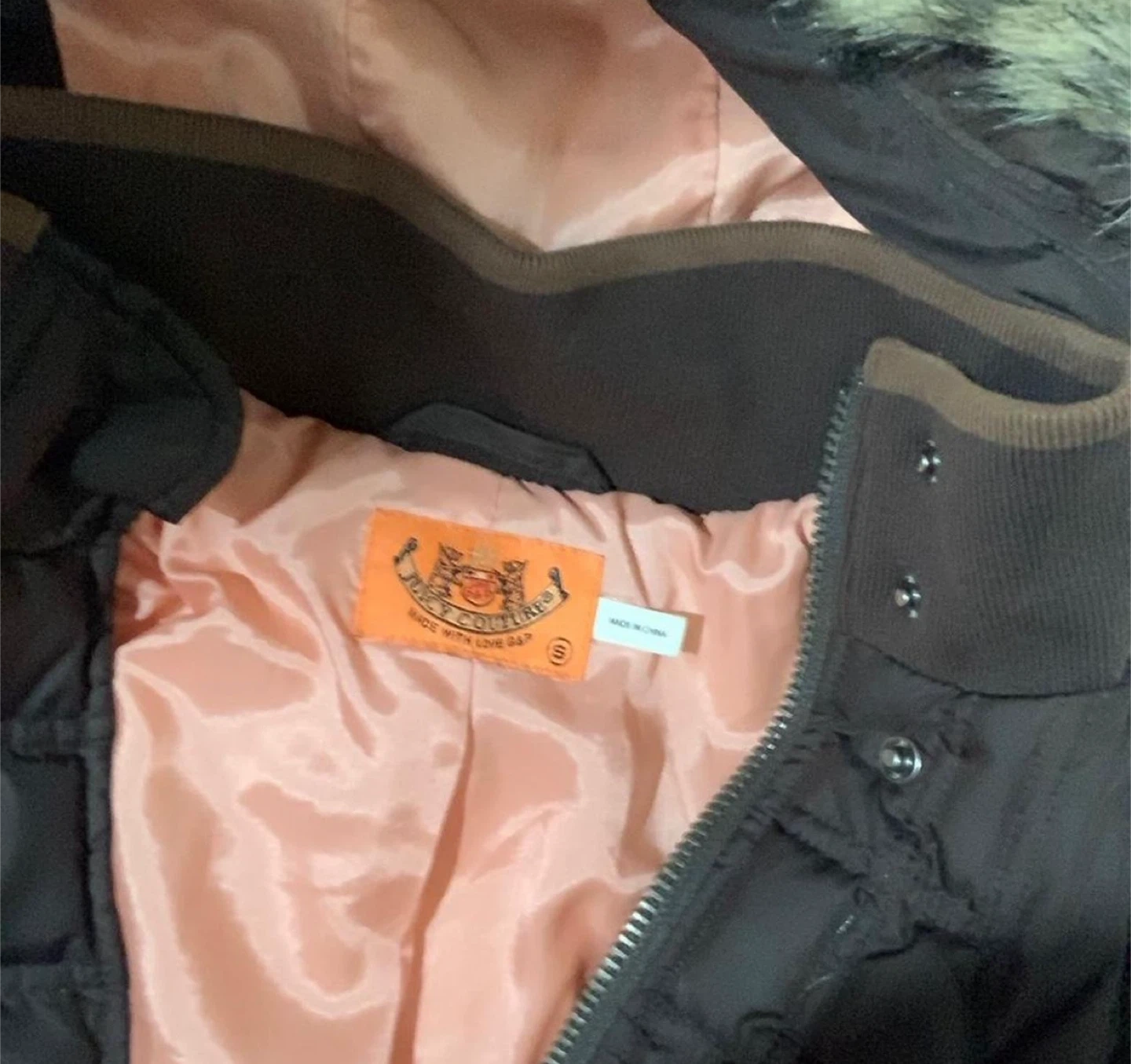 Juicy Couture puffer jacket in brown. It's a size small. The lining is a soft pink colour. It has a faux fur-lined hood.