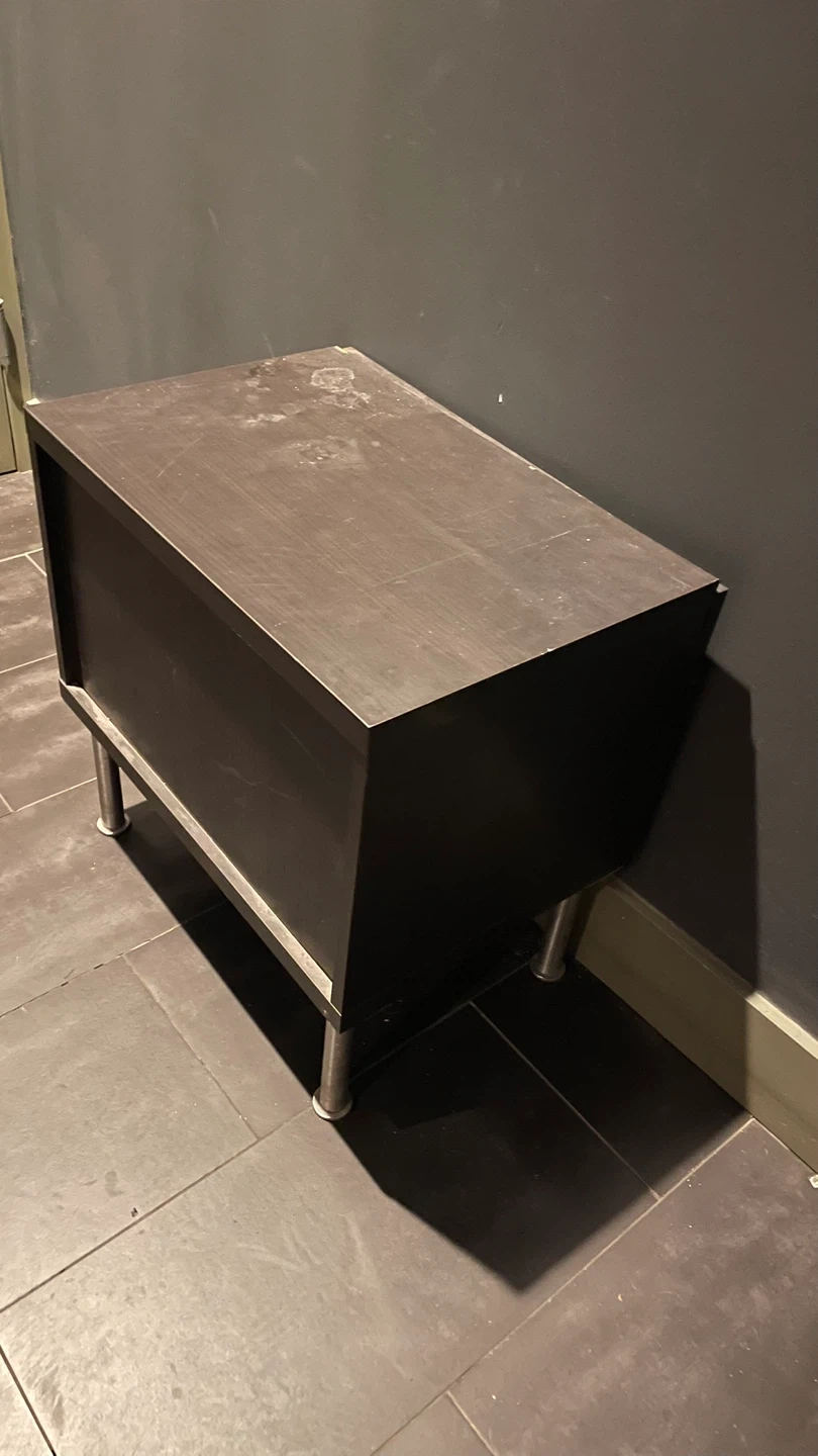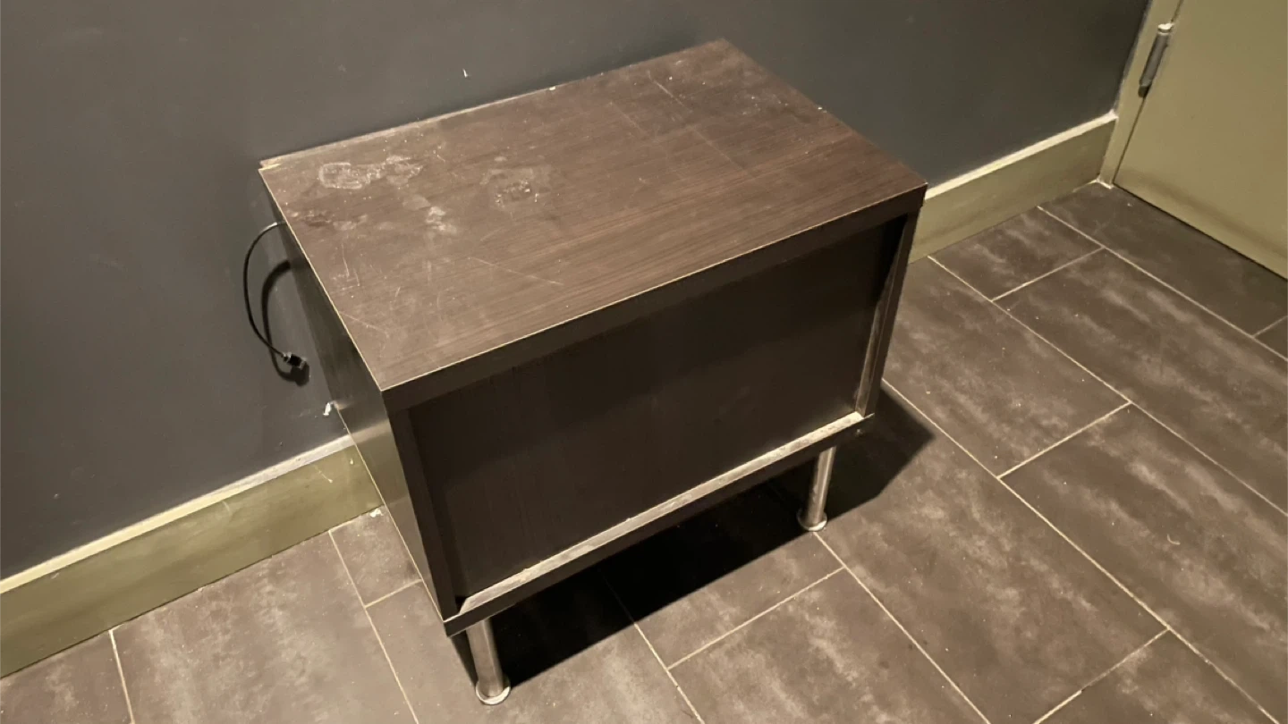 This nightstand features a dark brown wood-like finish and sleek metal legs. It's perfect for holding lamps, books, or other bedside essentials. Offers convenient storage space.