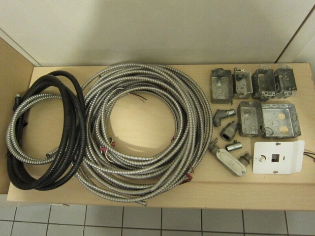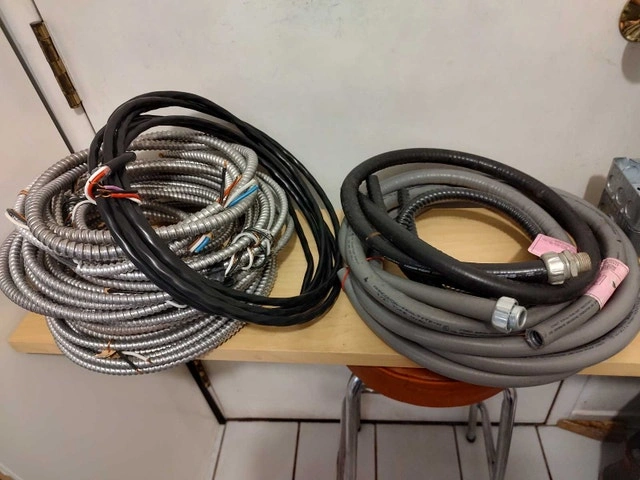 For sale: Various lengths of AC90 (BX) armored cable (14/2, 14/3, 12/2, 10/3) from 6 to 20 feet, priced at $2/foot. Also available: Domteck 20 ft 14/4 cable with black polyurethane insulation for $2/foot, and a short length of liquid tight conduit for $2/foot. Located downtown near College subway station.