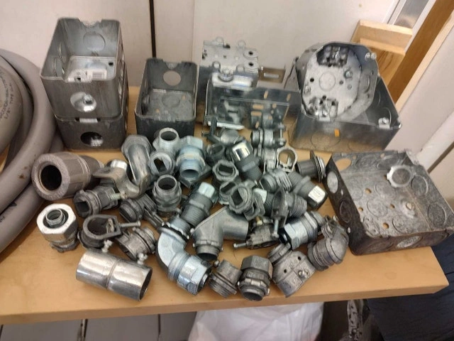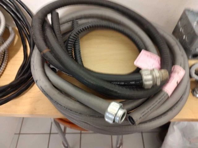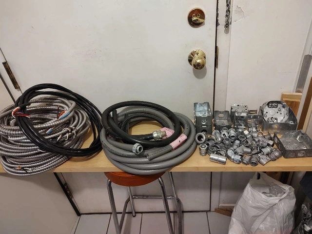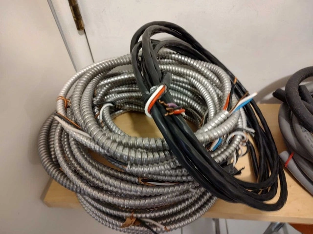 For sale: Various lengths of AC90 (BX) armored cable (14/2, 14/3, 12/2, 10/3) from 6 to 20 feet, priced at $2/foot. Also available: Domteck 20 ft 14/4 cable with black polyurethane insulation for $2/foot, and a short length of liquid tight conduit for $2/foot. Located downtown near College subway station.