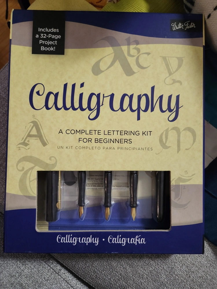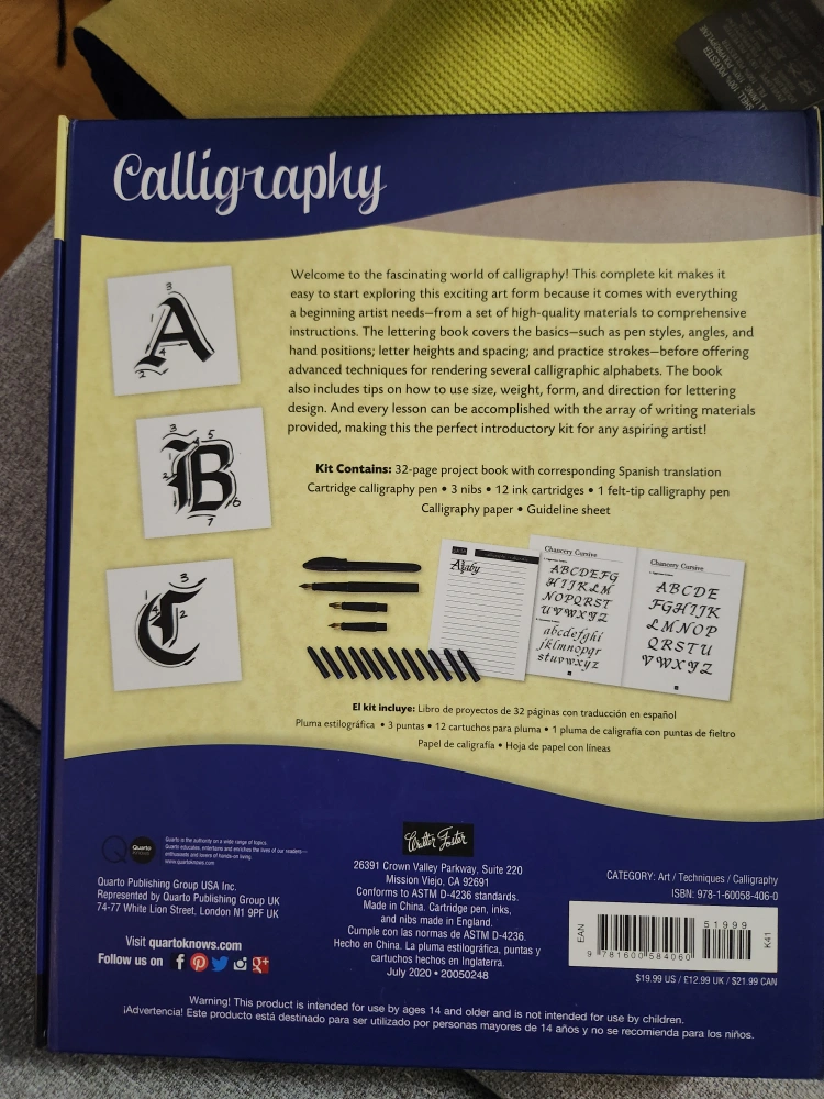 Complete lettering kit. Includes cartridge calligraphy pen, nibs, guide sheet, felt-tip pen, and 32-page project book. Perfect for beginners. English and Spanish instructions.