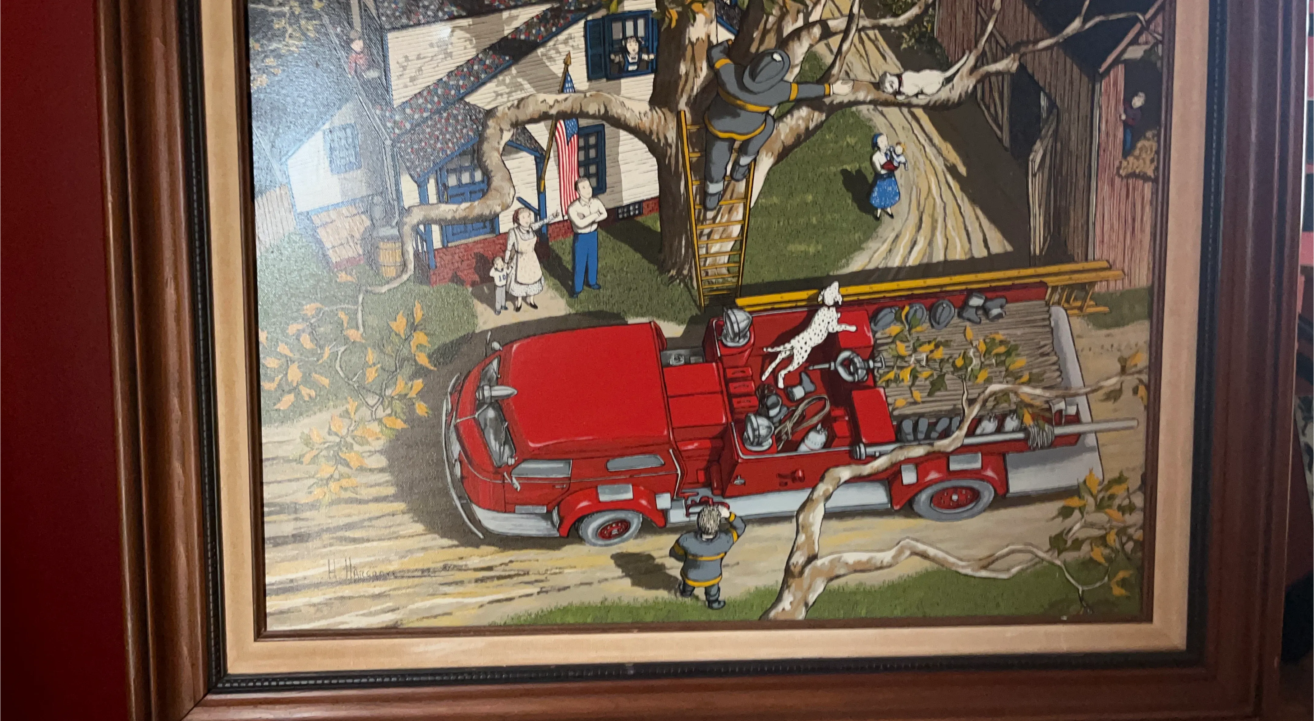 Charming folk art painting depicting a fire rescue scene. Features a vintage red fire truck, a firefighter on a ladder, and a dalmatian. This piece captures a whimsical moment of community help. Signed by artist H. Harco.