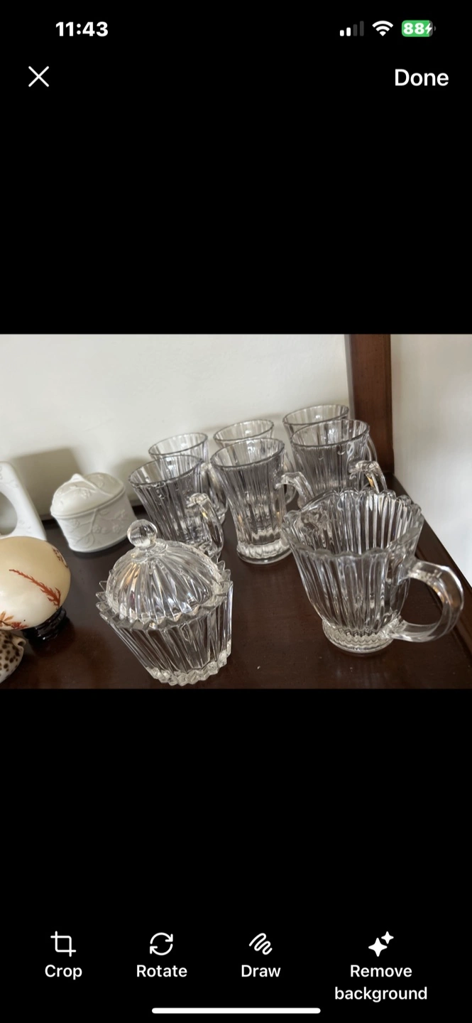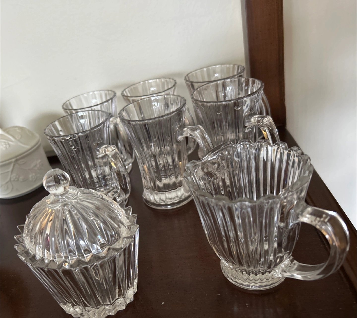 A set of six clear glass mugs with ribbed detailing. Includes a matching lidded sugar bowl. Glass material.