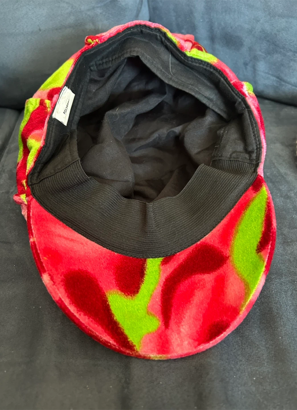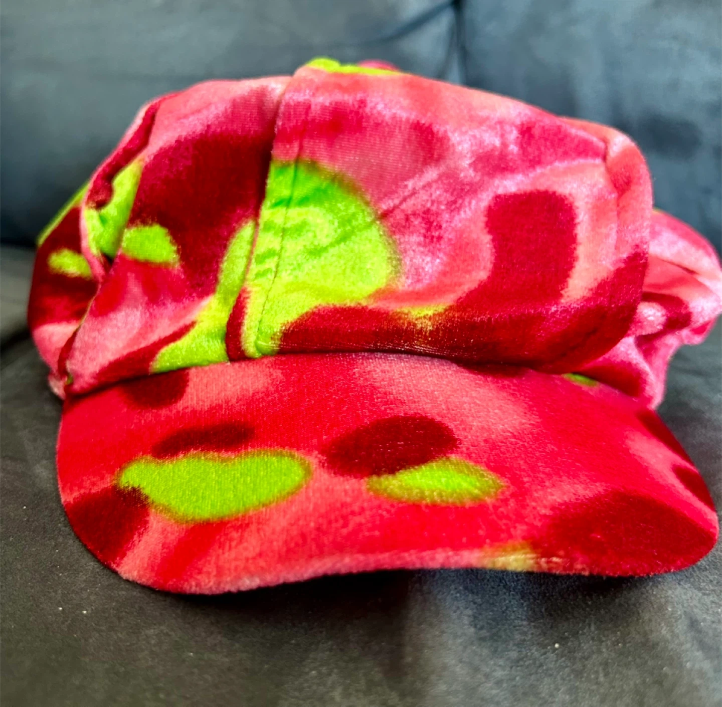 This is a soft velvet cap with a vibrant pink and green abstract pattern. It features an elasticated inner band for a snug fit. The material feels plush and the design is eye-catching!