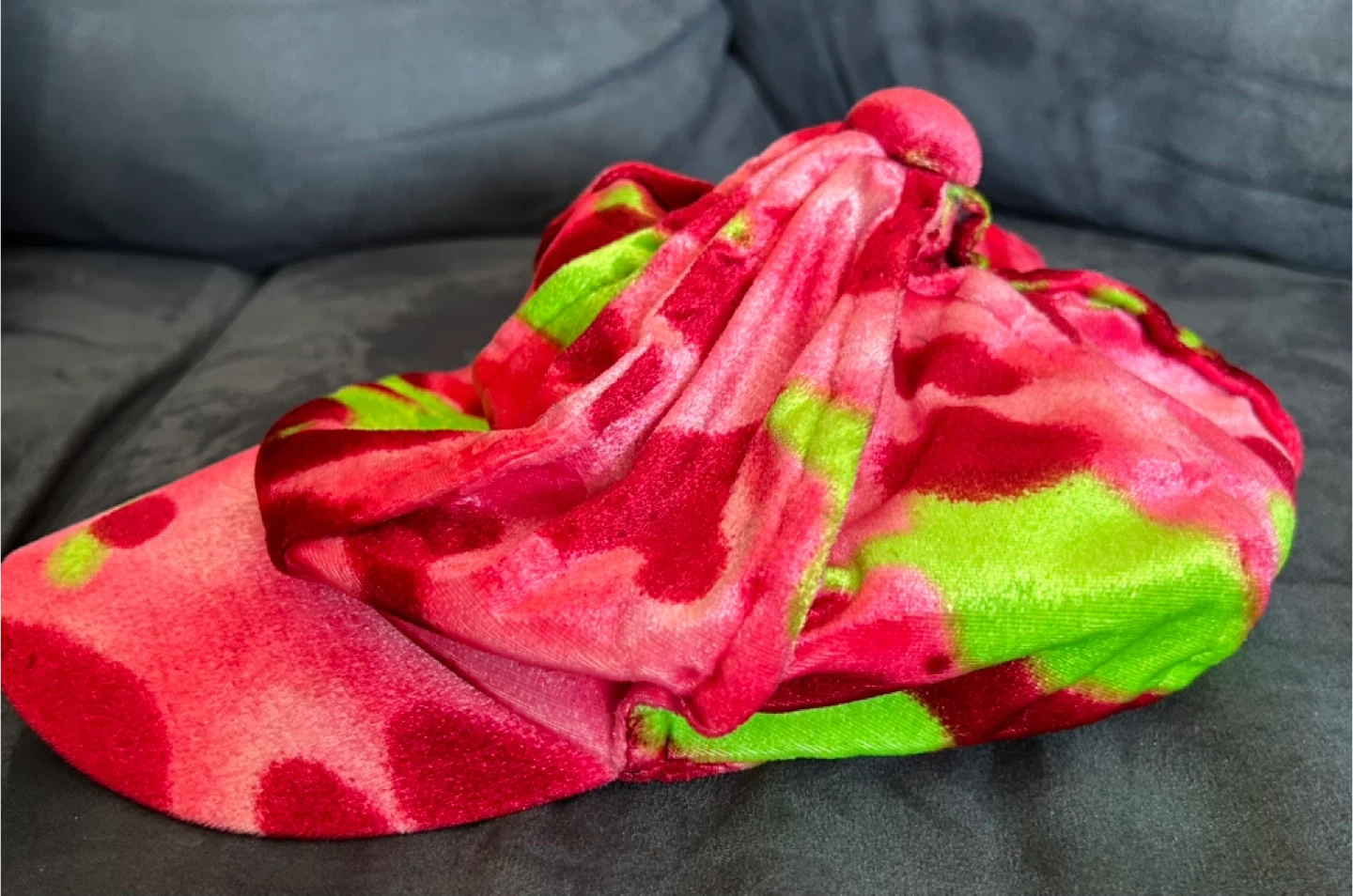 This is a soft velvet cap with a vibrant pink and green abstract pattern. It features an elasticated inner band for a snug fit. The material feels plush and the design is eye-catching!
