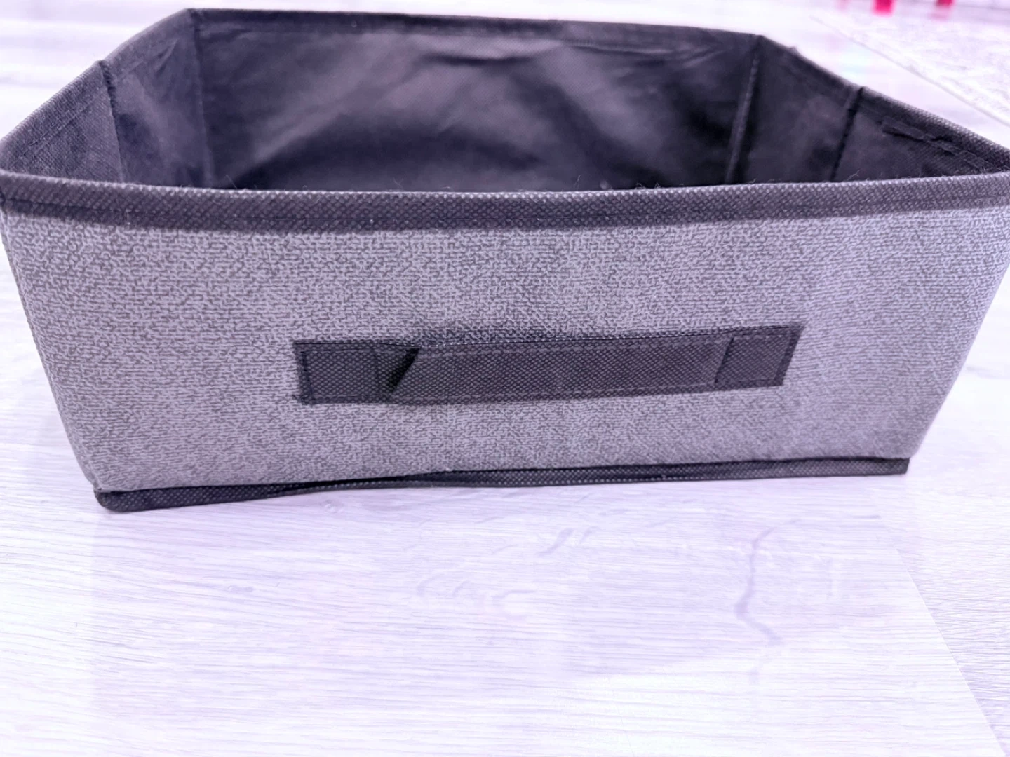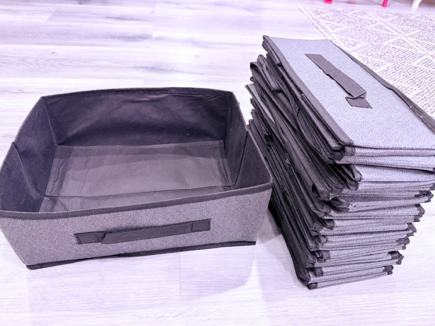 This set includes eight foldable grey fabric storage bins. They're made of durable fabric with convenient side handles. Perfect for organizing shelves, closets, or any living space!