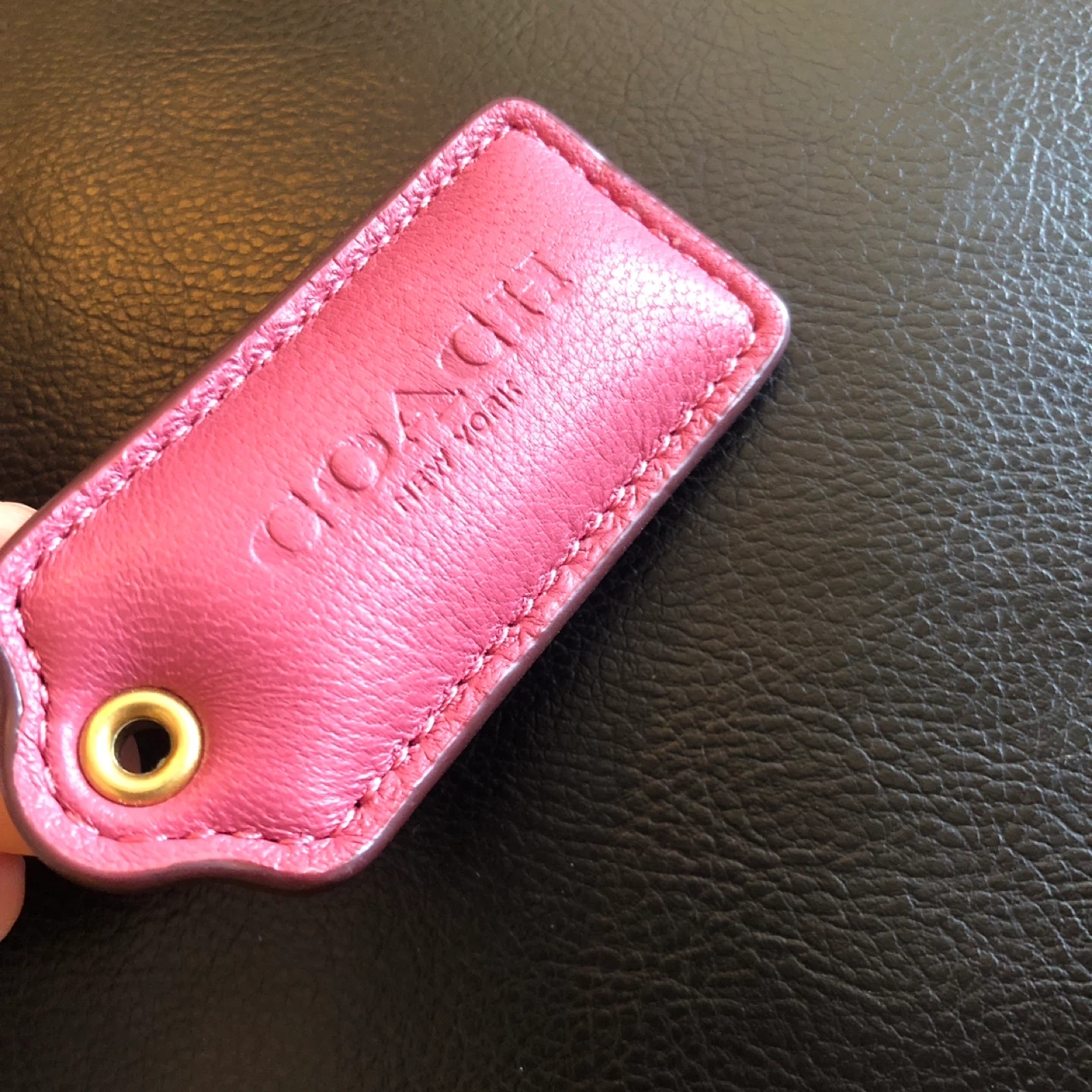 This is a pink leather tag from Coach New York. It features the embossed Coach logo and 'New York'. Genuine leather construction with gold-tone grommet.