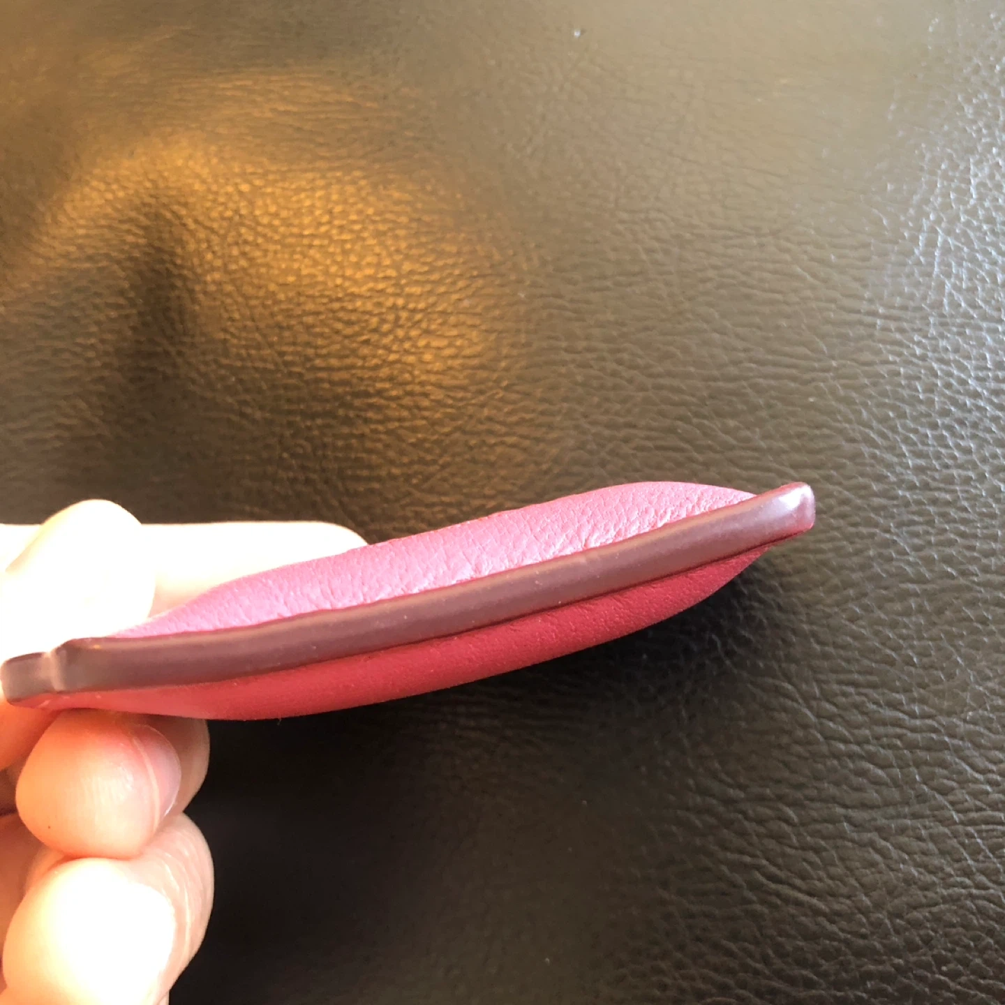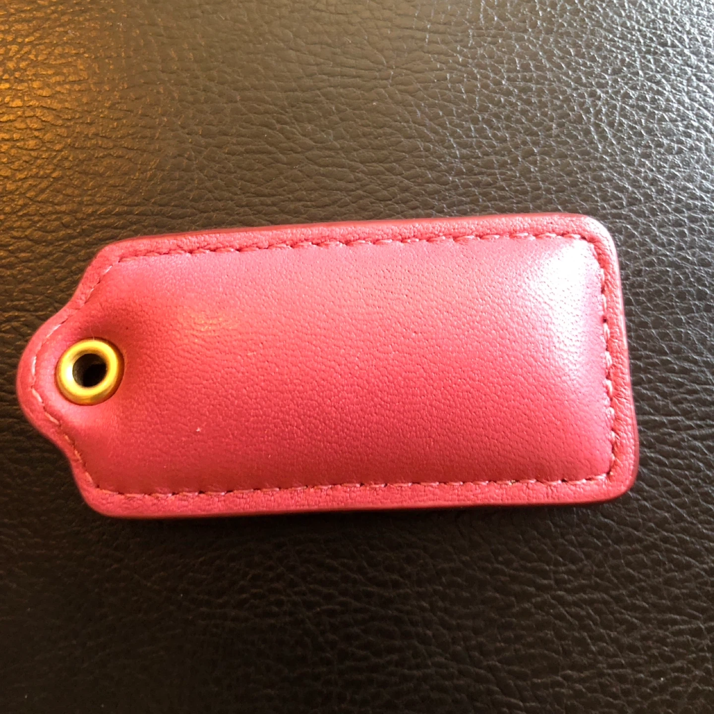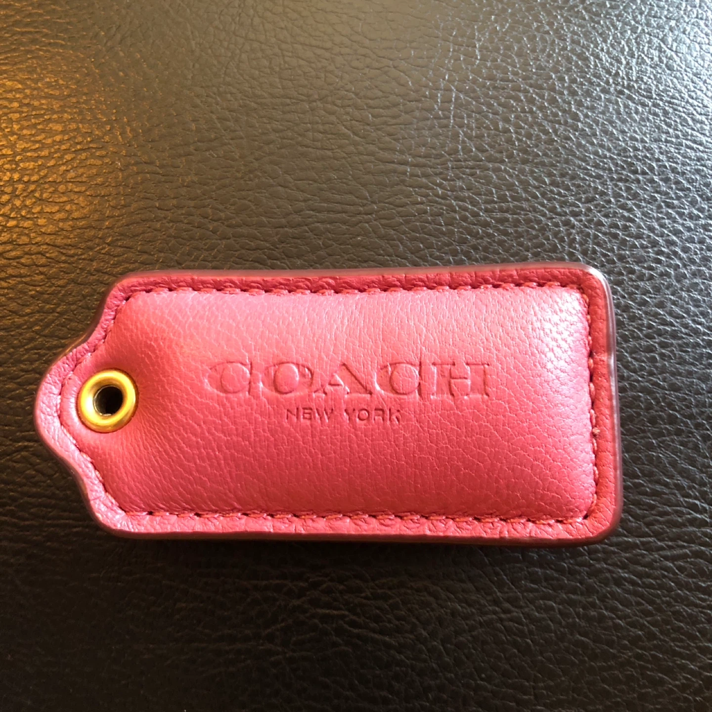 This is a pink leather tag from Coach New York. It features the embossed Coach logo and 'New York'. Genuine leather construction with gold-tone grommet.