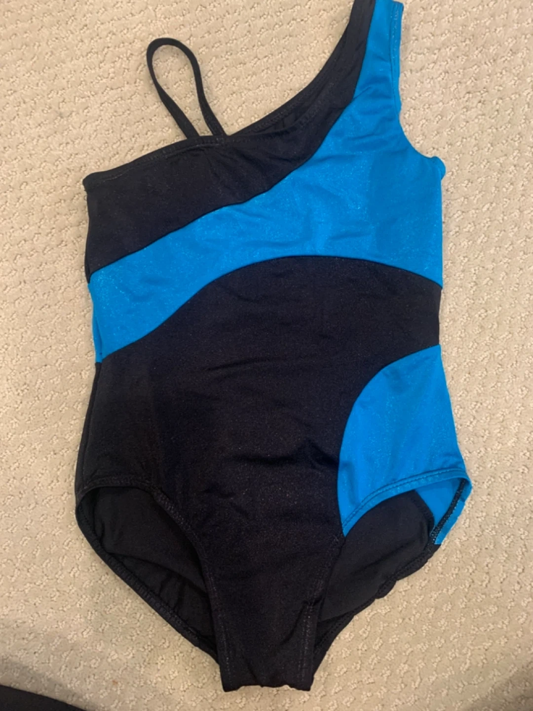 Balera MC leotard, perfect for dance or gymnastics! It's in great condition and features a stylish black and blue design. The body is made of 80% nylon and 20% spandex, with a 100% polyester lining.
