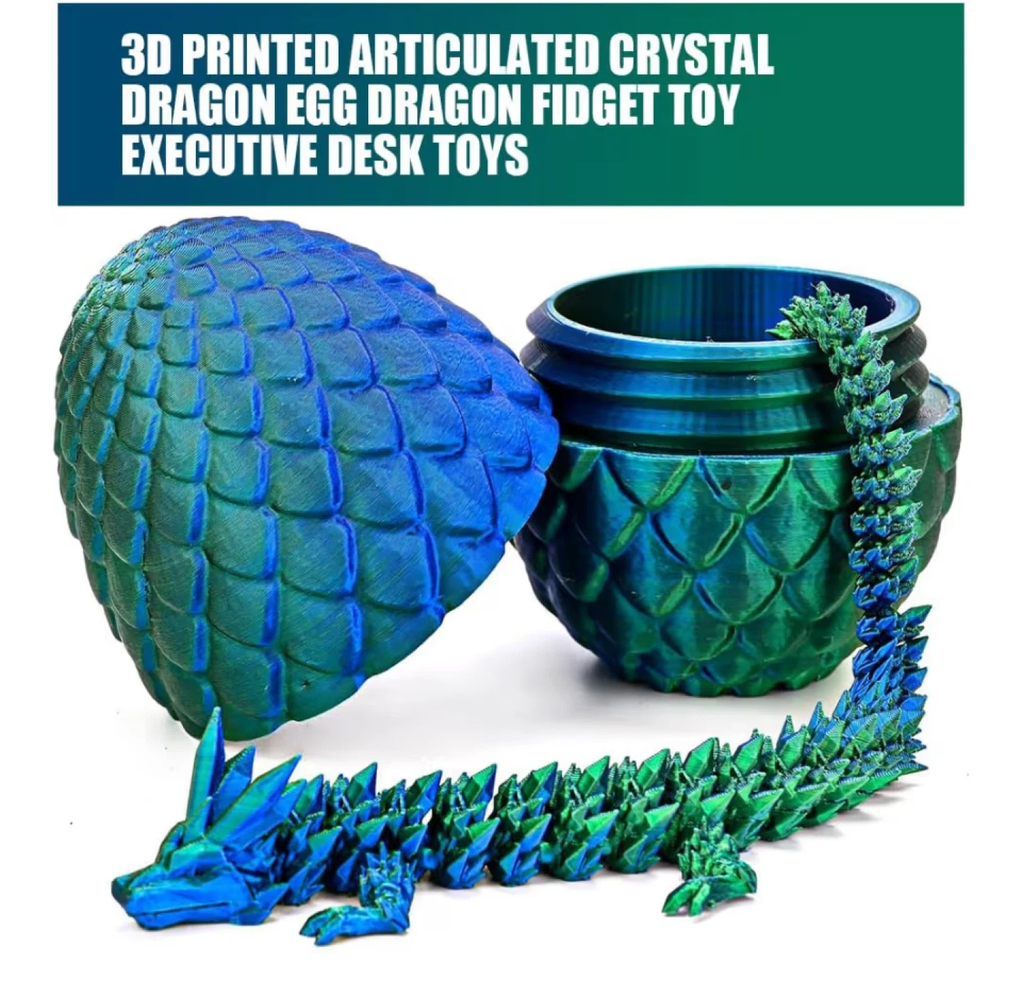 This is a 3D printed articulated crystal dragon egg with a dragon fidget toy. The egg measures approximately 3.14 inches in height and 2.36 inches in width. The dragon is approximately 8.66 inches long. It's a beautiful and exquisite desk toy! $5 each or 5 for $20