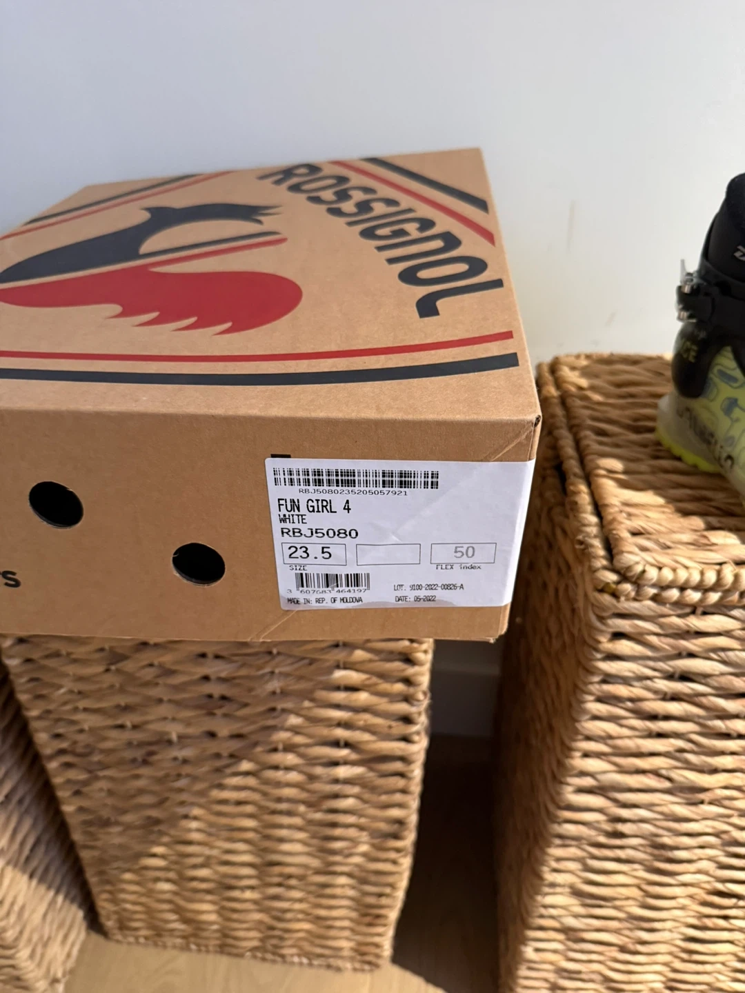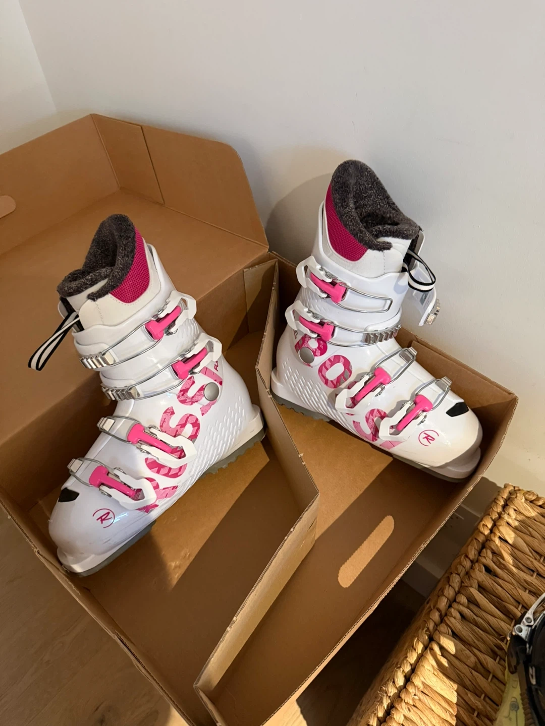 Rossignol Fun Girl J4 ski boots in white with pink accents. These boots are a youth size 23.5 with a flex index of 50. Comes with the original box.