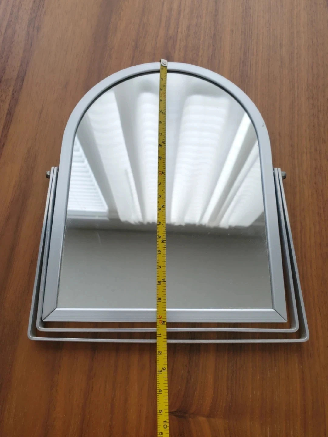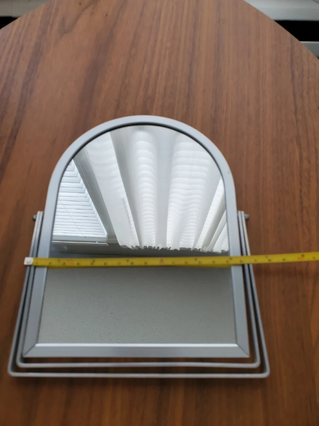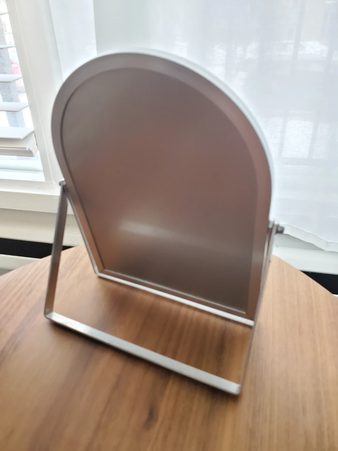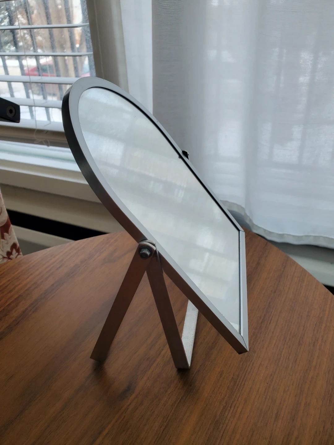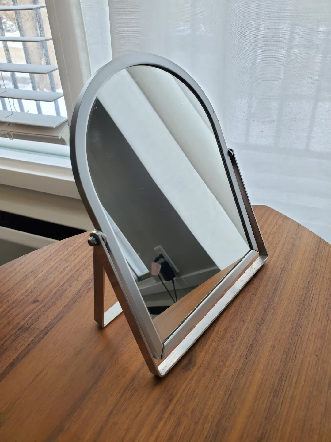 A metal arched frame mirror with an adjustable stand. Approximately 8 inches tall and 6 inches wide and can flatten for tight storage. Pickup in Mission area.