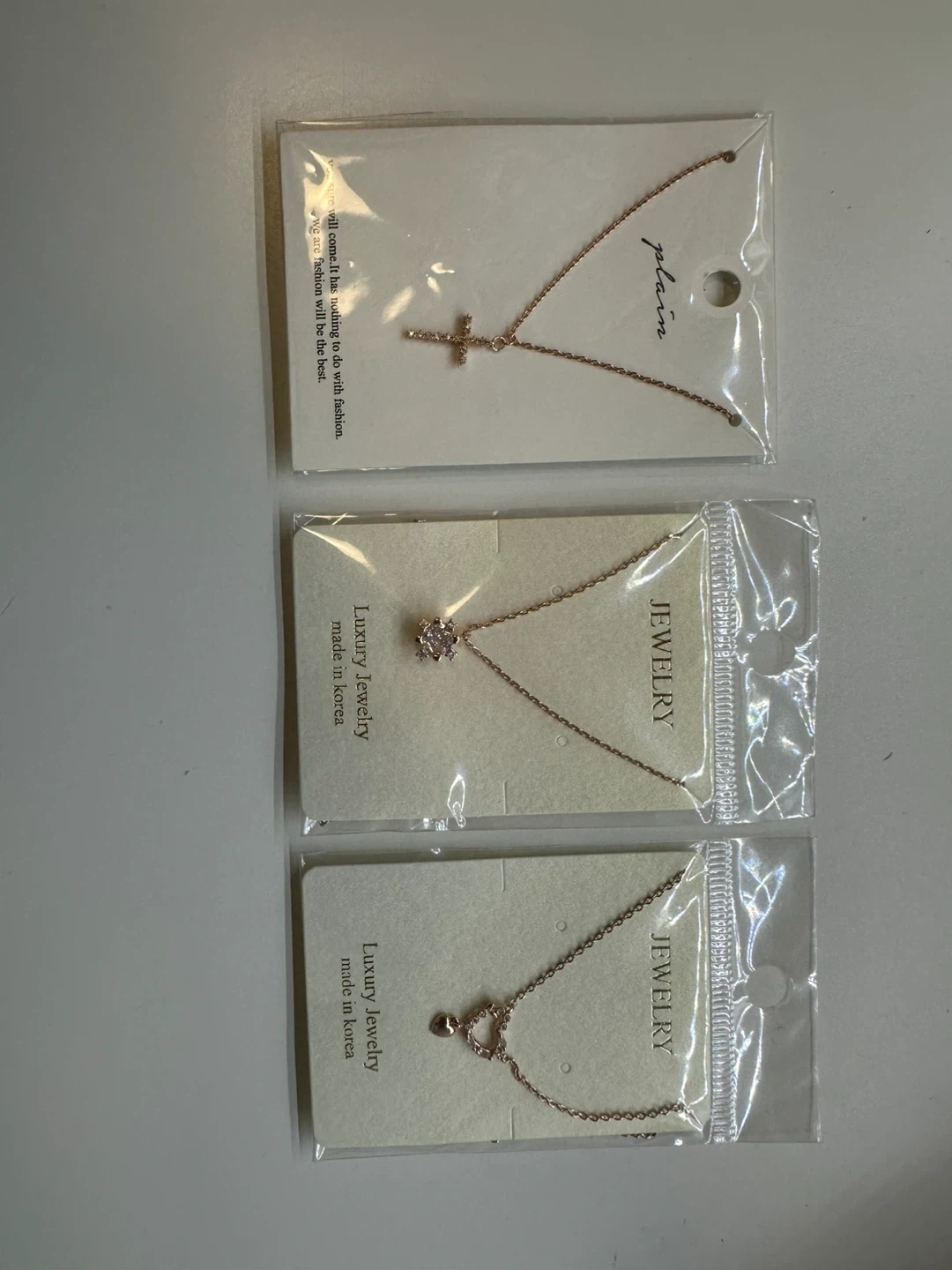 Each necklace has a different pendant design: one with a cross, one with a flower, and one with a heart. All have tiny sparkly stones. Comes new in original packaging. Made in Korea.