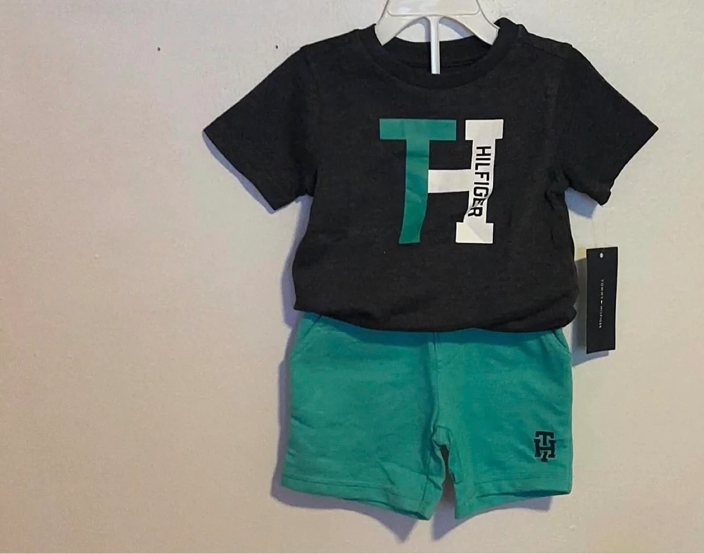 This new Tommy Hilfiger outfit is perfect for your little one, featuring a stylish navy blue T-shirt with the iconic 'TH' logo and matching green shorts with a subtle logo detail. The set is brand new with tags, ensuring top-notch quality and style.