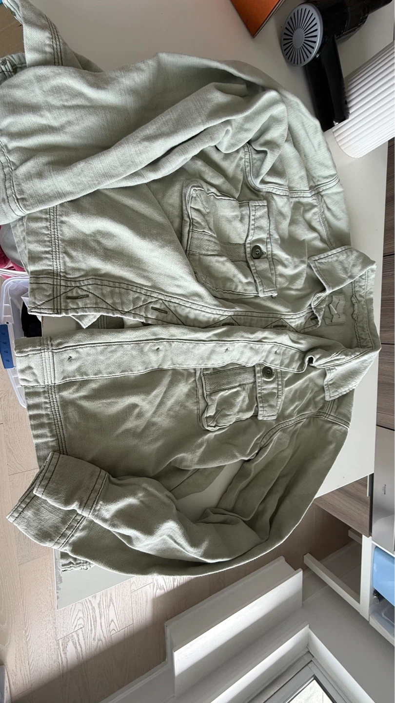 This American Eagle shirt jacket comes in a light green colour. It's a size S/P CH. Features two chest pockets with button closures.