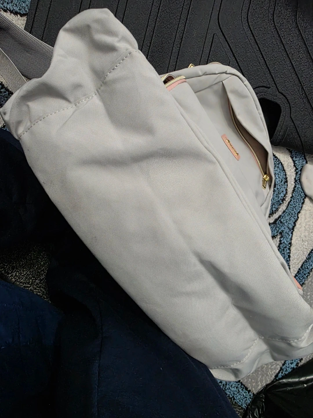 This LOVEVOOK backpack is gray with pink accents. It features a top handle and adjustable shoulder straps. It includes a drawstring pouch accessory.