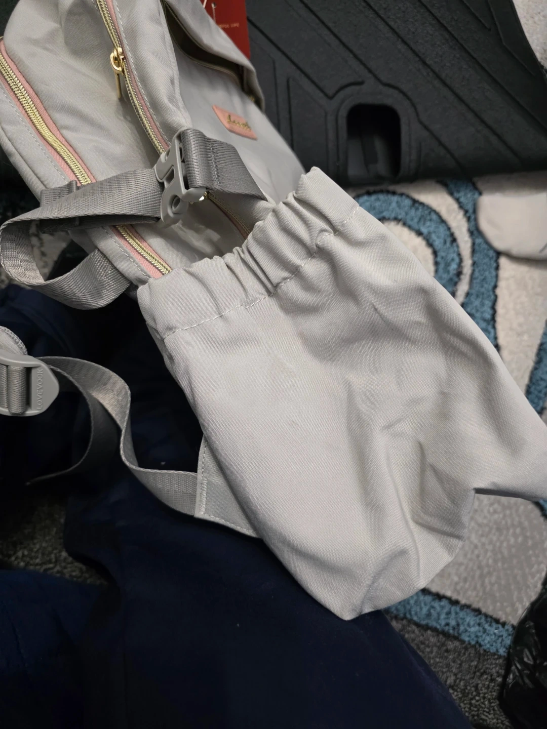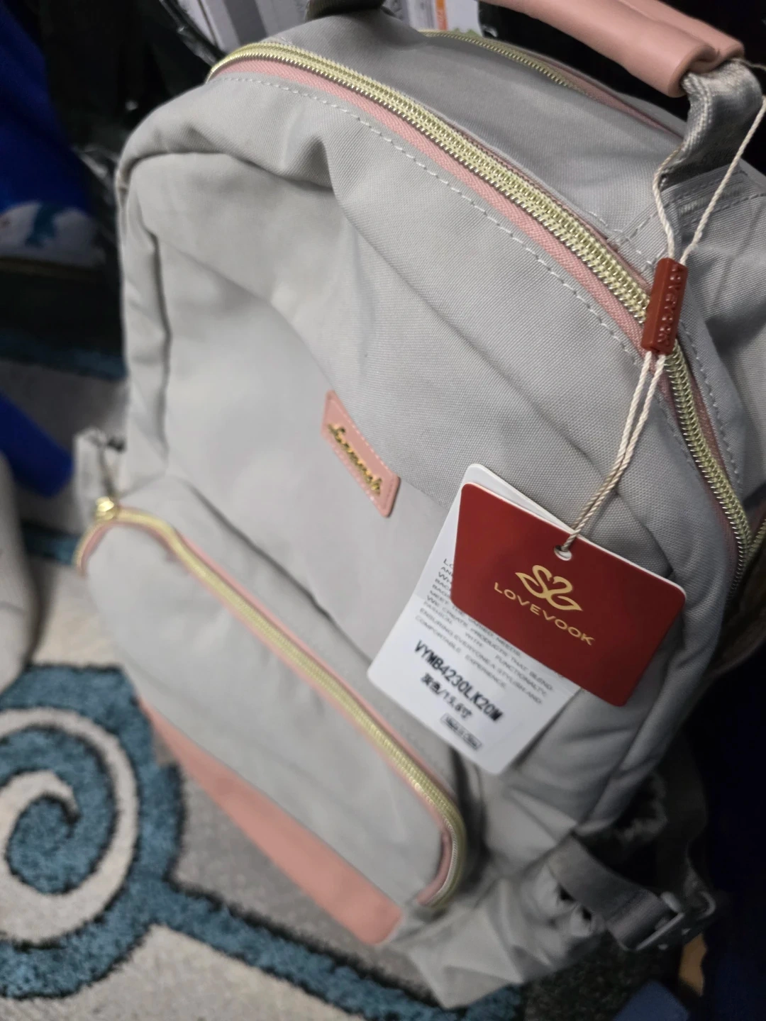 This LOVEVOOK backpack is gray with pink accents. It features a top handle and adjustable shoulder straps. It includes a drawstring pouch accessory.