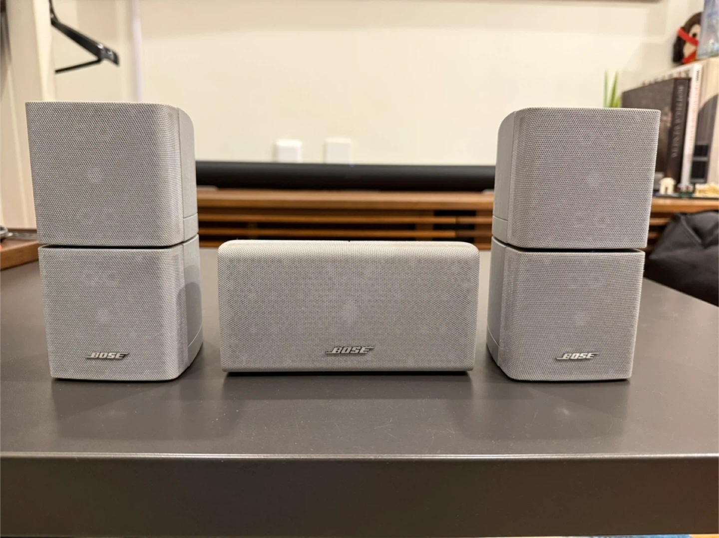 Selling a Bose Acoustimass 10 Series IV home theater speaker system. It includes two cube speakers (for L and R channels), a center channel speaker, the Acoustimass Module (powered subwoofer), and all required cables. Great for creating a home theater sound experience in your living room!