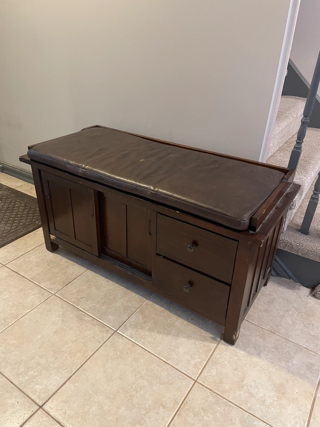 This dark brown entryway bench offers convenient storage with its sliding door cabinet and two drawers. The cushioned top provides a comfortable place to sit. Wood construction with faux leather seat.