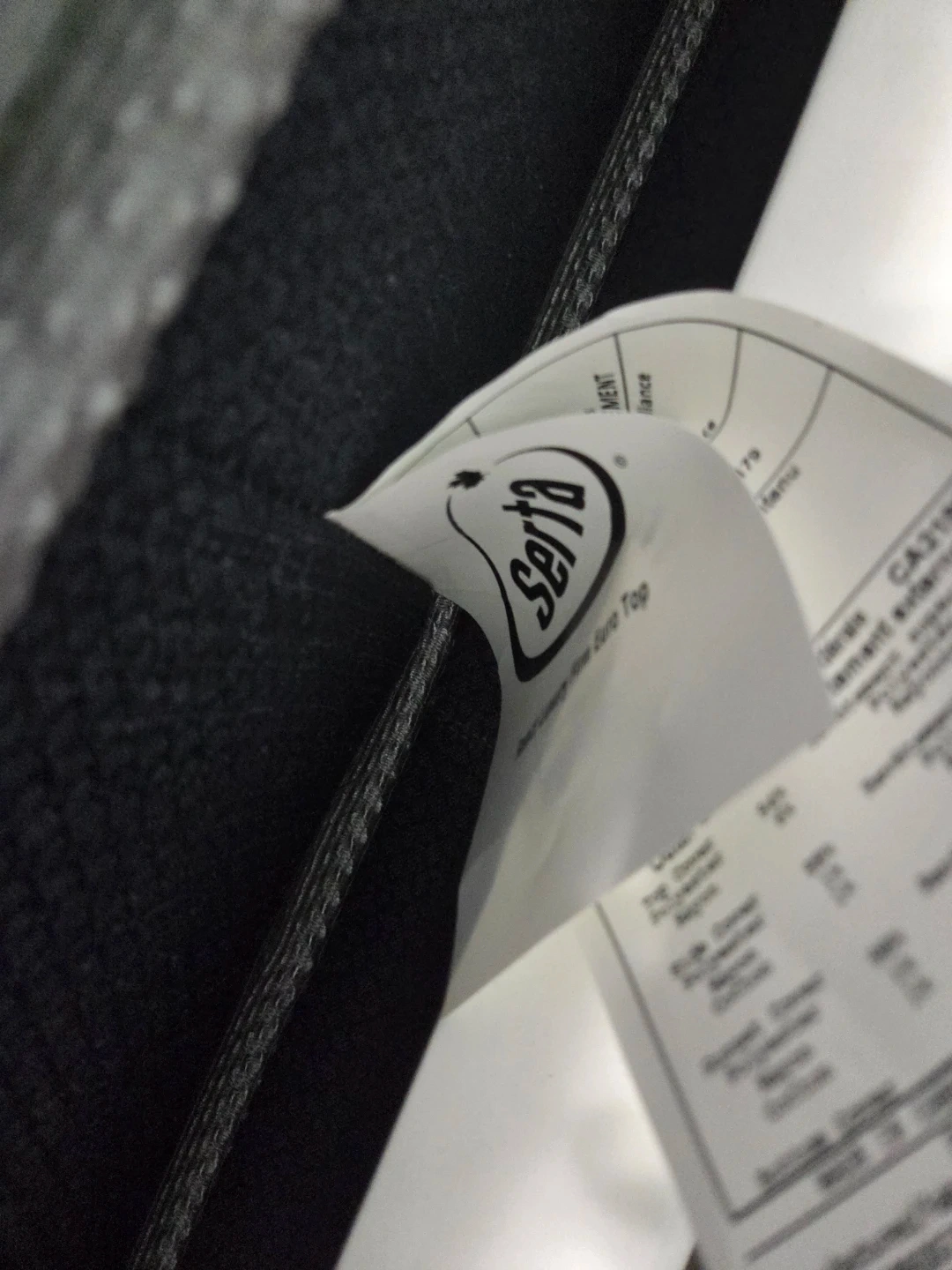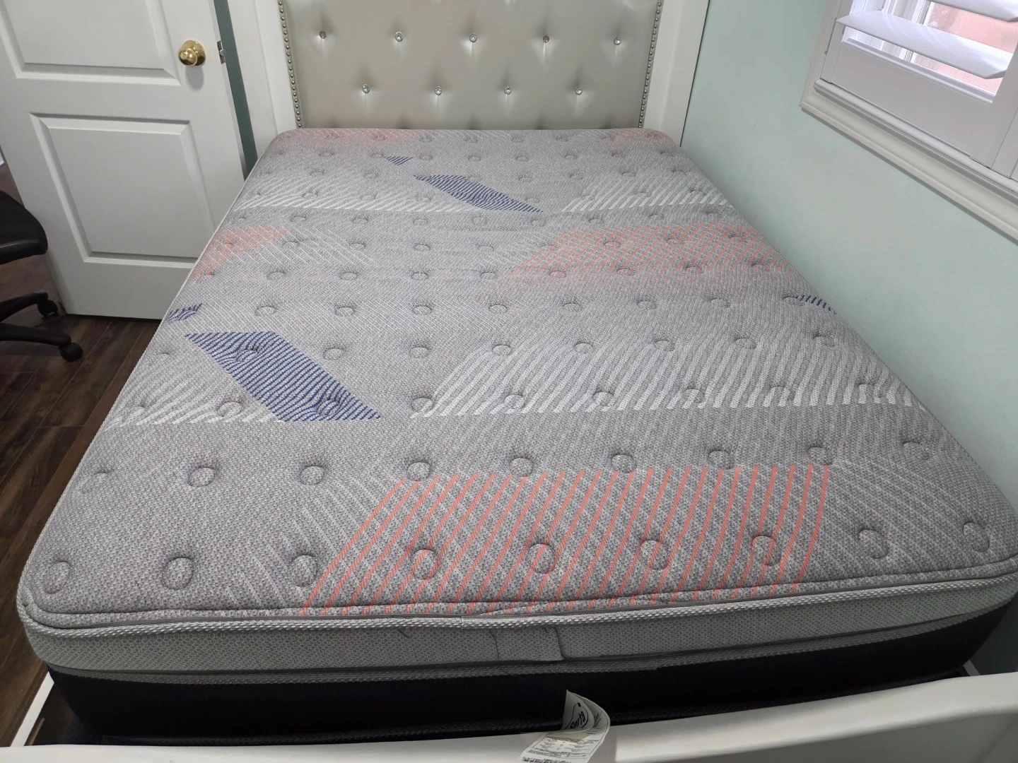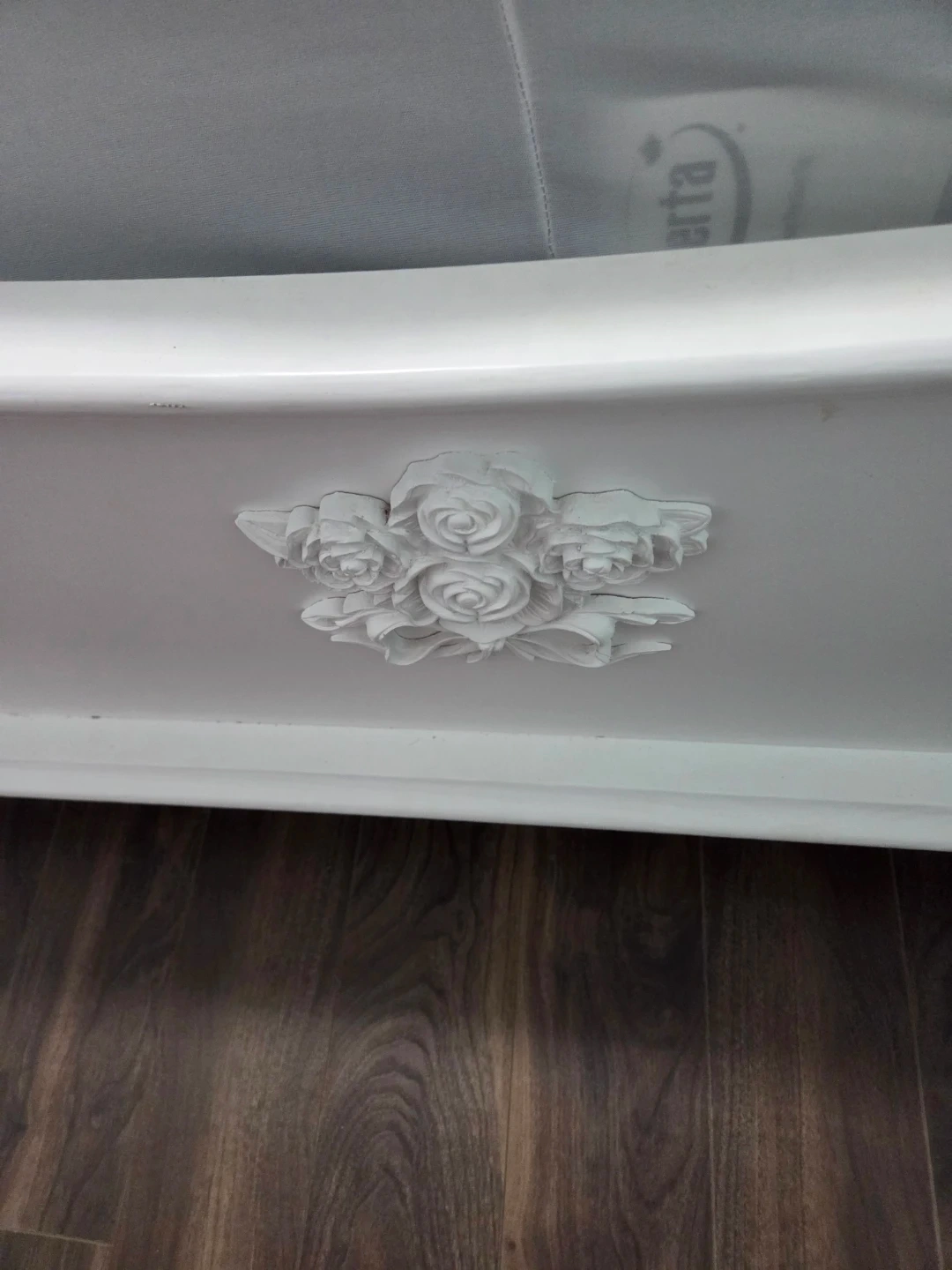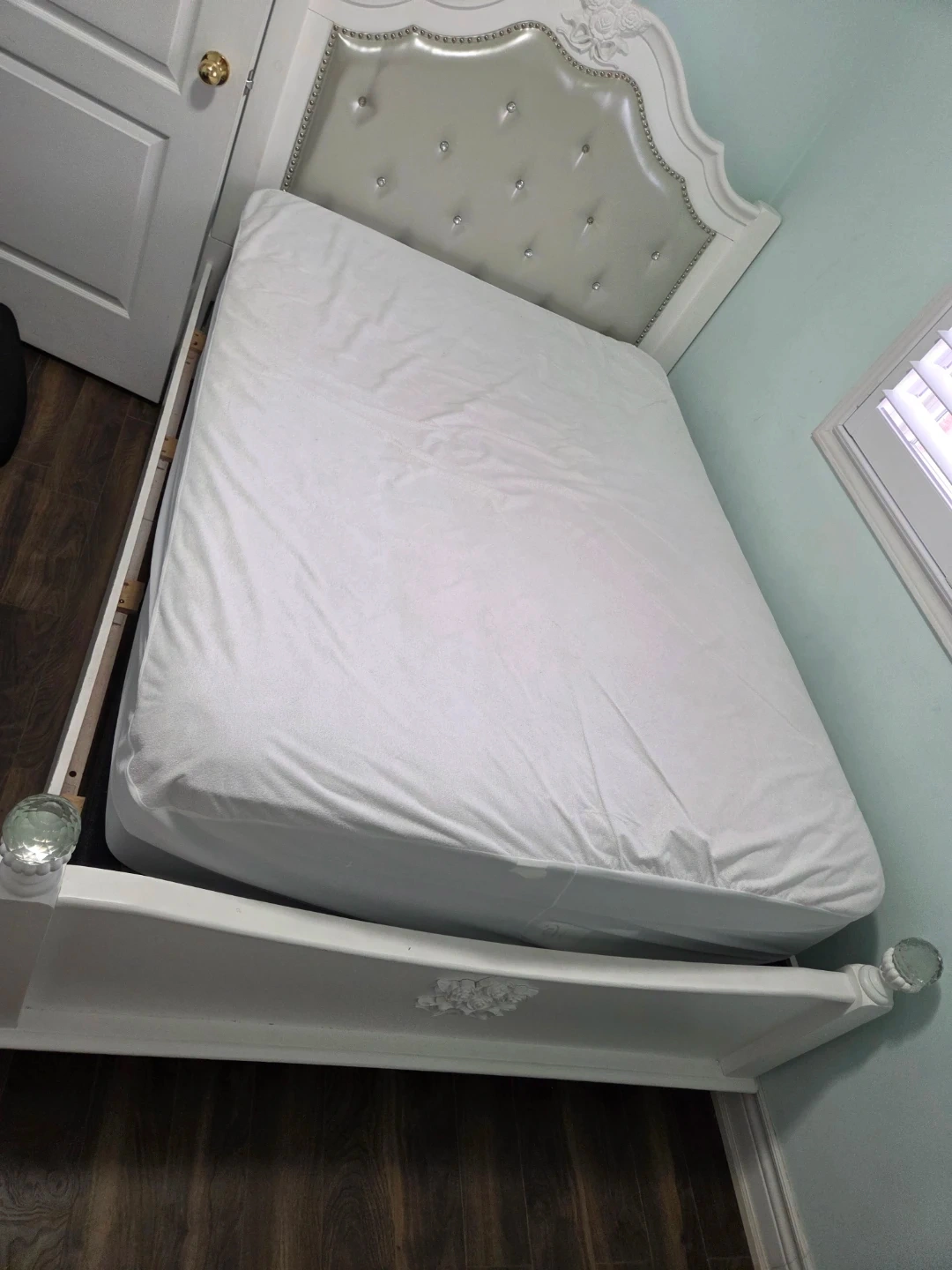 Beautiful white Full bed frame with a padded, crystal-tufted headboard. It features ornate floral carvings on the footboard and headboard posts. A Serta mattress is included.