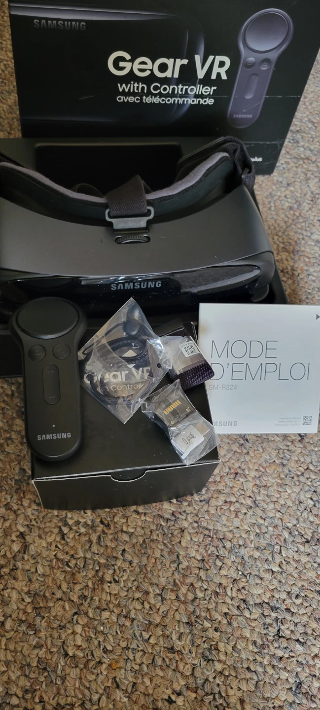Selling a Samsung Gear VR with Controller, model number SM-R324. It comes with the original box and all included components. A great way to experience virtual reality!🥕need samsung phone to make it work