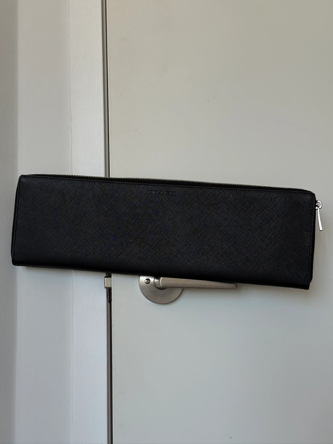 This is a Coach black zip-around travel organizer wallet pouch. It's made of textured leather and features multiple interior straps and pockets for organization. A handy item for keeping your travel essentials together!