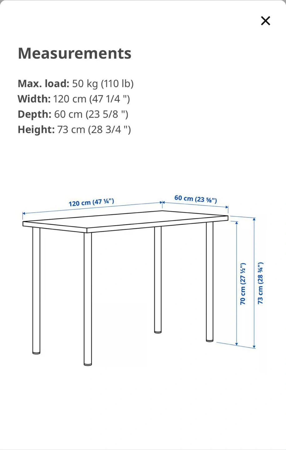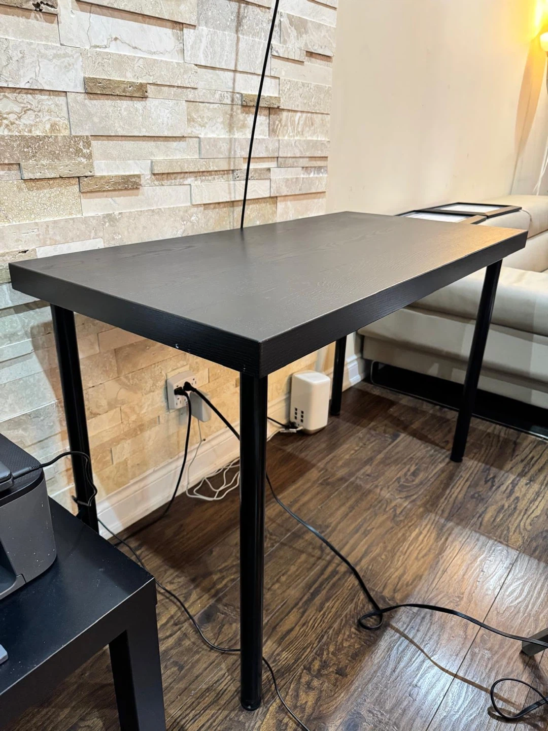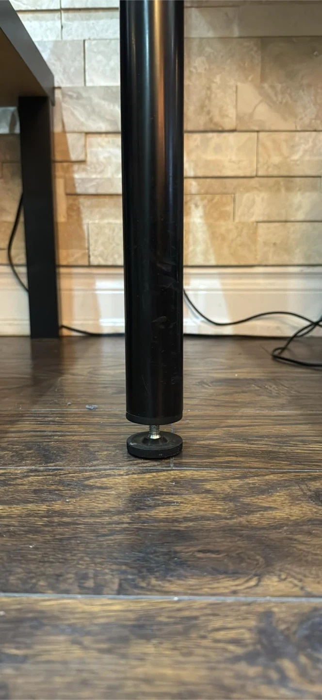 This black desk is 120 cm wide. It has adjustable feet for stability. The tabletop has a wood grain finish and black legs.