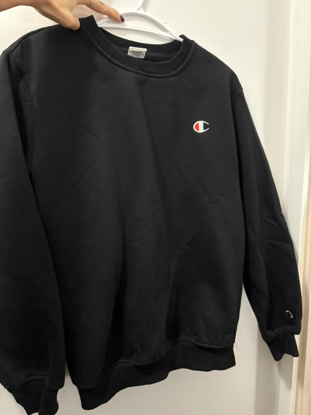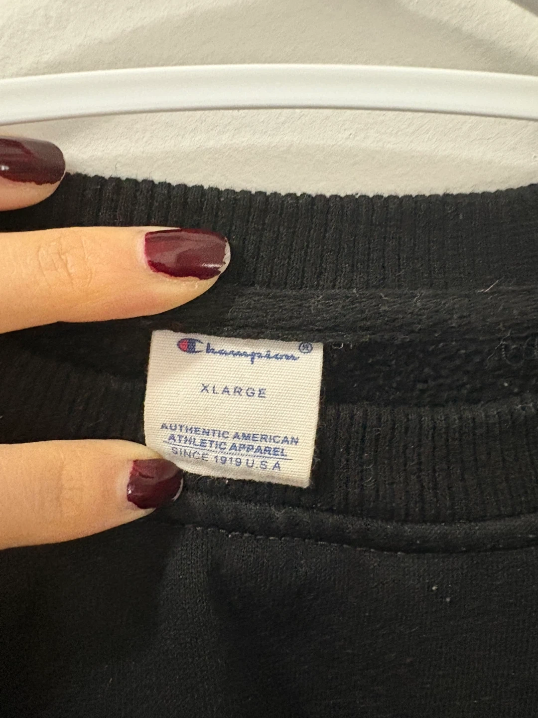 This is a black Champion crewneck sweatshirt in size youth XL (adult small)