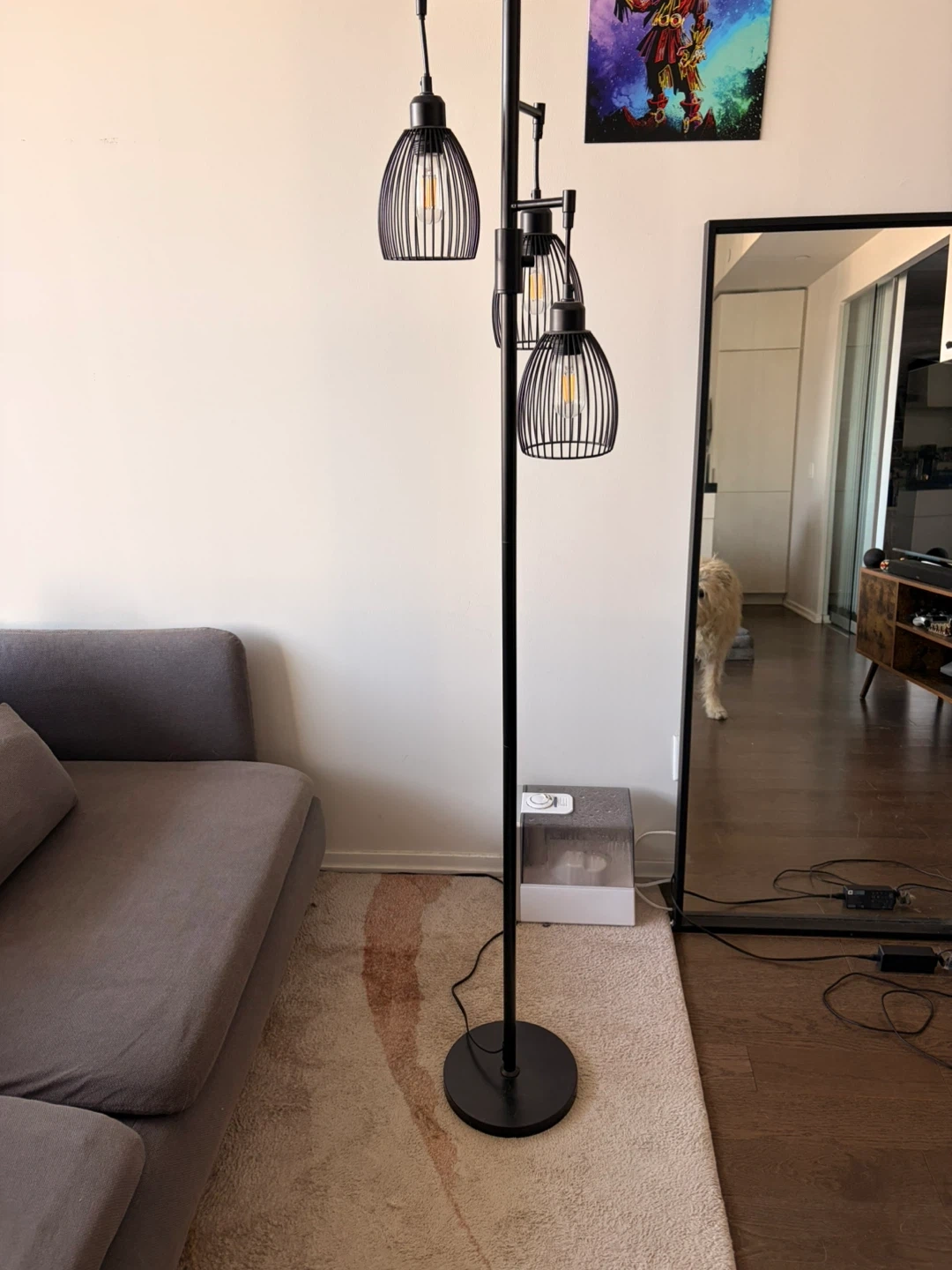 This black floor lamp has three adjustable lights with a caged design. It's a stylish addition to any room. The lamp is about 5.5 feet tall.